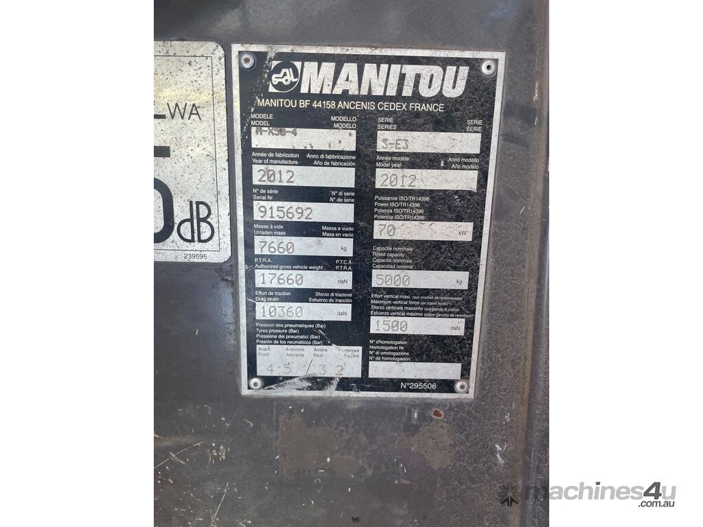 CP: CIRCA 2012,Manitou,M-X50-4,All Terrain Forklift,Odometer not visible,3836 (Hrs. Showing on Hour meter),Unregistered,Serial No: 915692,Sold with No Plates