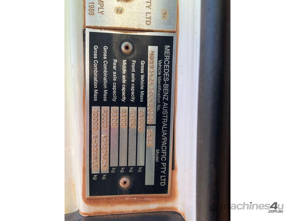 CP: 01/2012,Mercedes Benz,Actros 2655,Prime Mover,Automatic & Manual Mode,Air,8 Cyl,Diesel Turbo,323074 (Kms. Showing on Odometer),10889 (Hrs. Showing on Hour meter),Colour: White,Rego. No: 1DXM263 WA,VIN: WDB9342412L480738,Key No: 319,Length: 7.5 m,GVM: 26000,GCM: 90000,Sold with No Plates,Key No: 319