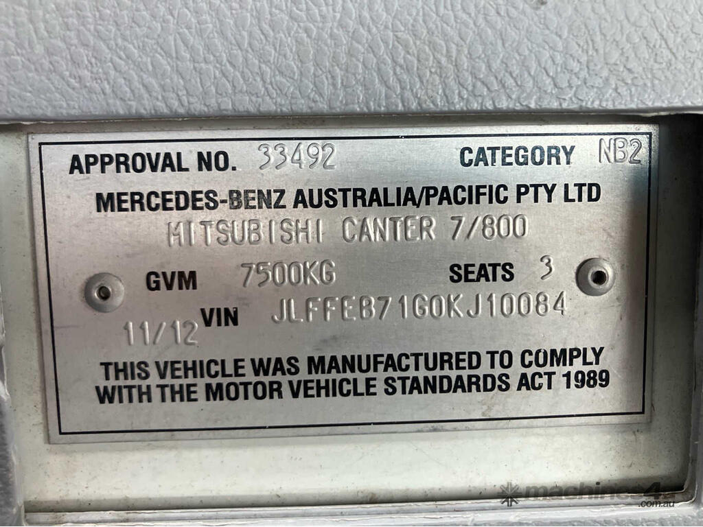 CP: 11/2012,Mitsubishi Fuso,Canter 815,Cab Chassis,Manual,Spring,4 Cyl,Diesel,Turbo,69124 (Kms. Showing on Odometer),Hourmeter not visible,Colour: White,Unregistered,VIN: JLFFEB71G0KJ10084,Length: 6.7 m,GVM: 7500,GCM: 11000,Sold with No Plates
