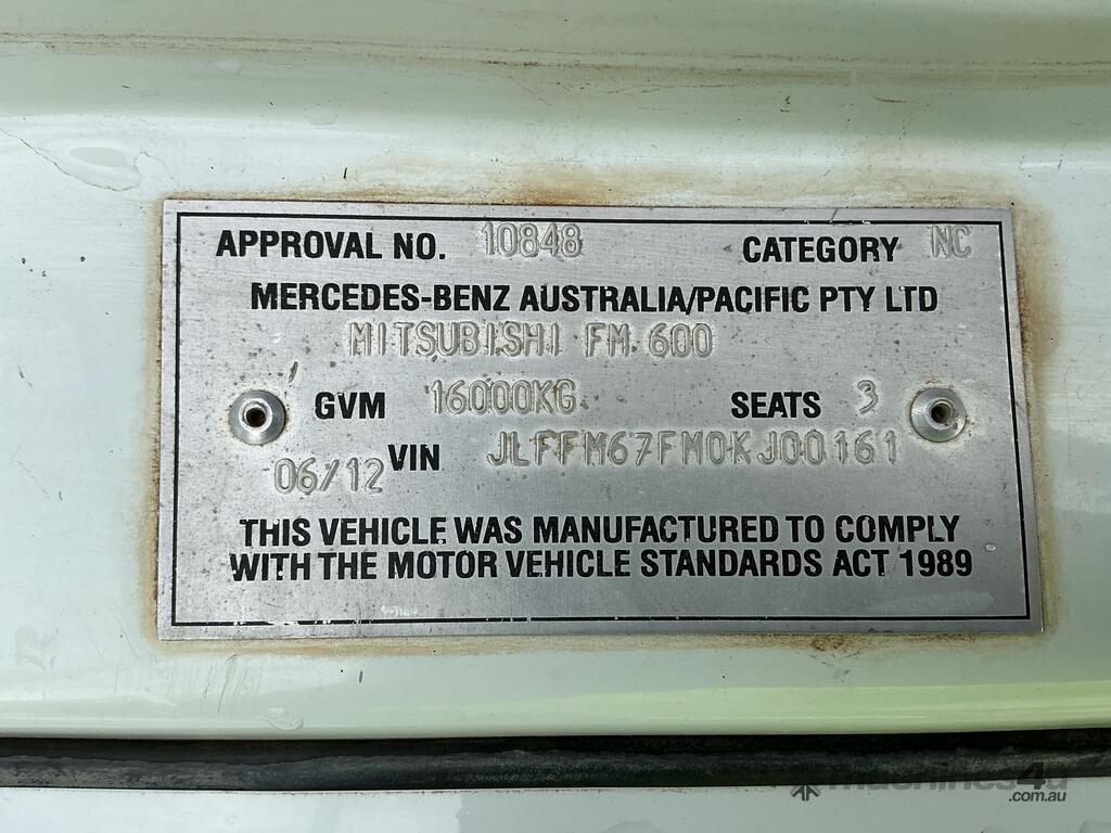 CP: 06/2012,Mitsubishi Fuso,Fighter 1627,Beaver Tail,Manual,Air Bag Suspension,Mitsubishi Fuso 6M60-9AT2,6 Cyl,Diesel,9 Gears,129182 (Kms. Showing on Odometer),Hourmeter not visible,Colour: White,Rego. No: NP(ZCG498), Unregistered,VIN: JLFFM67FM0KJ00161,Key No: 99,GVM: 16000,GCM: 32000,Sold with No Plates,Key No: 99