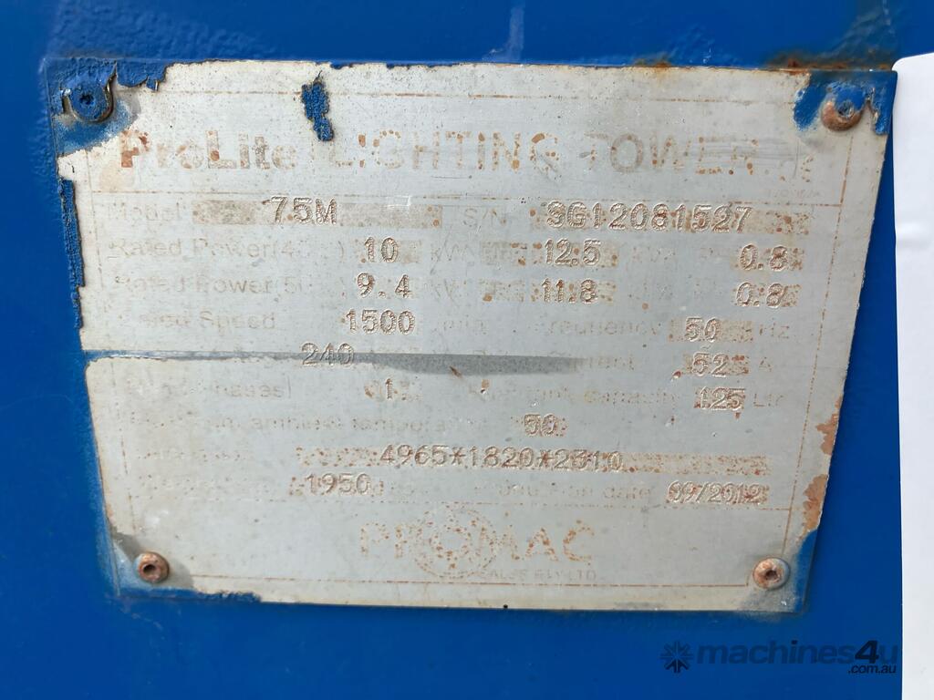 CP: 09/2012,ProLite,75M,Lighting Tower (Trailer Mounted),Hubometer not visible,Colour: Blue,Rego. No: NP(916UKR), Unregistered,VIN: 6K9AUCT1TLT344021,Serial No: SG12081527,Sold with No Plates