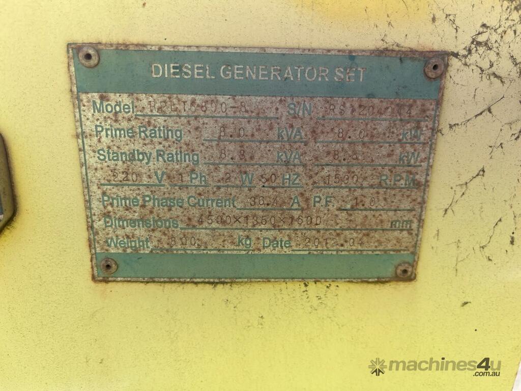 CP: 04/2012,Robust Power,RPLT-6800,Diesel Generator,3 Cyl,Odometer not visible,Hourmeter not visible,Colour: Yellow,Unregistered,Serial No: RS1204044,Sold with No Plates
