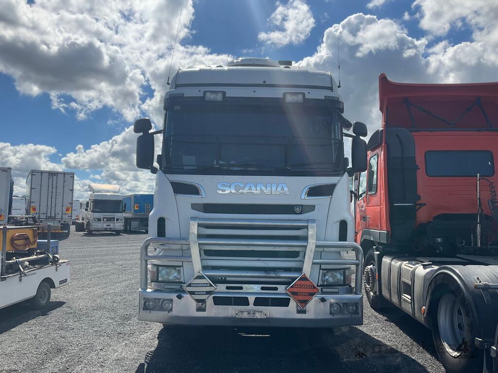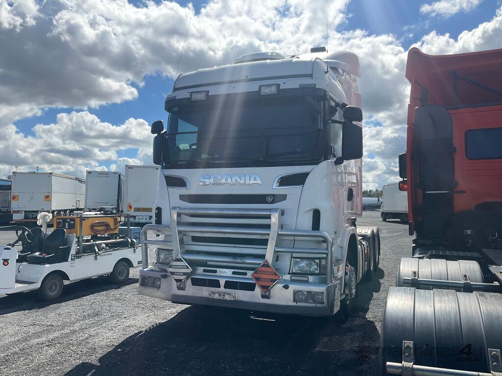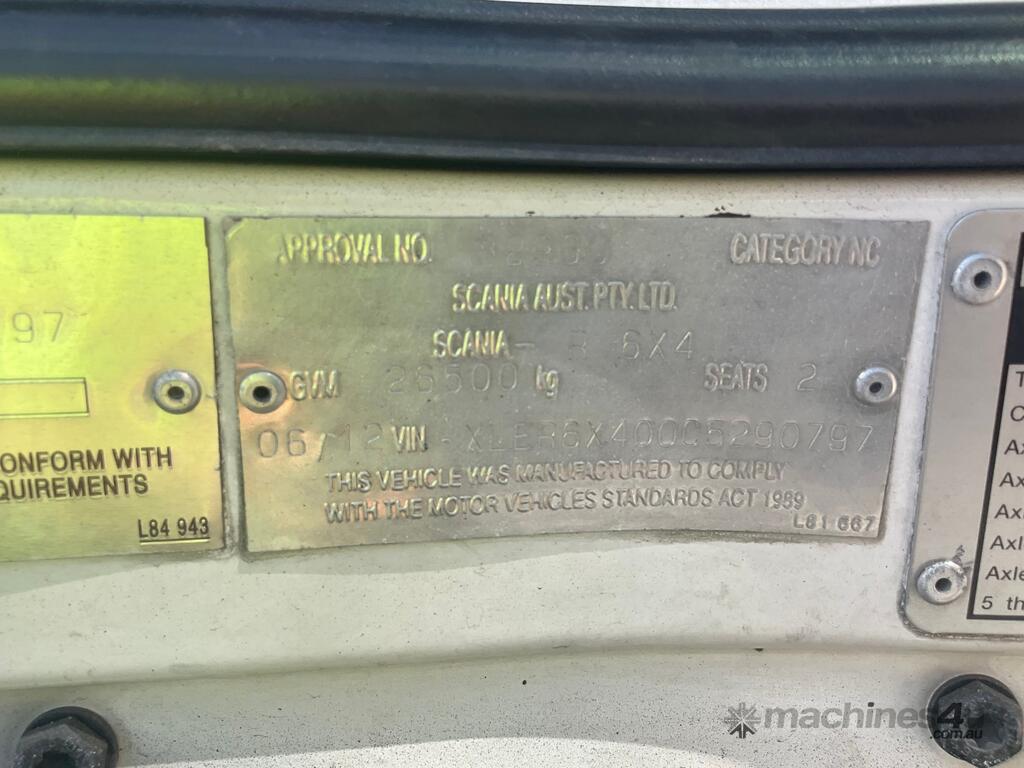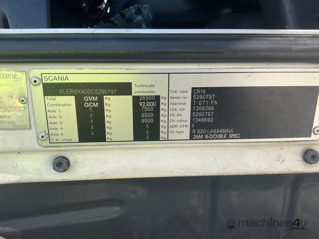CP: 06/2012,Scania,R620,Prime Mover,Automatic,Airbag,Diesel,Odometer not visible,Hourmeter not visible,Colour: White,Rego. No: NP(BZ08CV), Unregistered NSW,VIN: XLER6X400C5290797,Length: 6.9 M,GVM: 26500,GCM: 92000,Sold with No Plates,WOVR Status: WOVR N/A