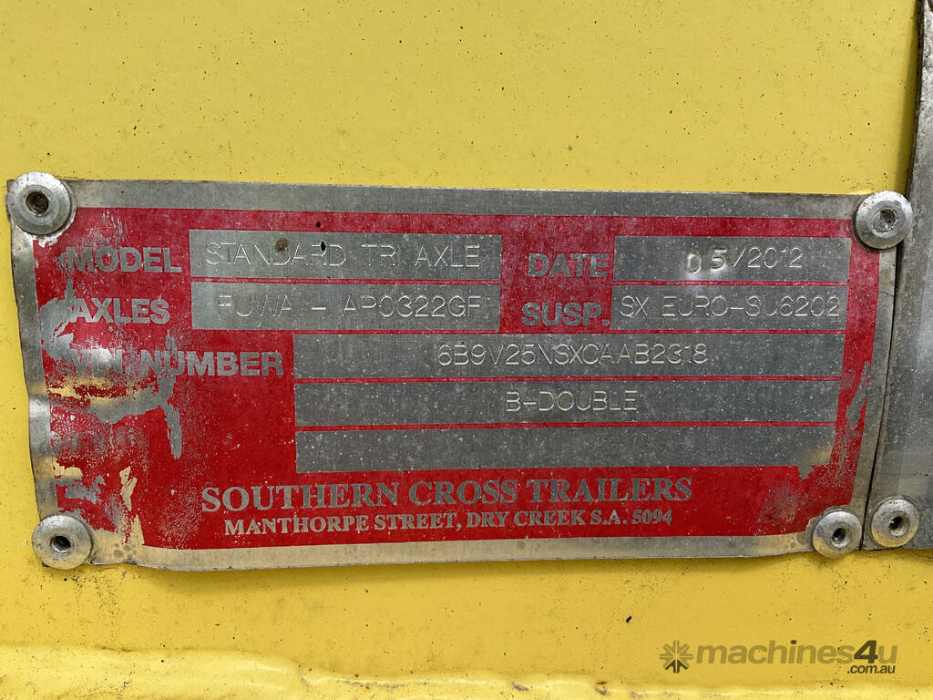 CP: 05/2012,Southern Cross Trailers,Standard Tri Axle,20ft,Tri Axle Skel A Trailer,50978 (Kms. Showing on Hubometer),Colour: Yellow,Rego. No: NP(YN67EL), Unregistered,VIN: 6B9V25NSXCAAB2318,Serial No: 6B9V25NSXCAAB2318,Sold with No Plates