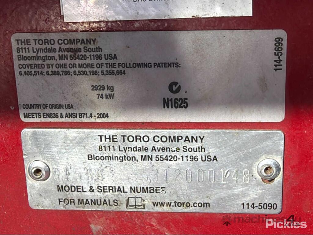 CP: CIRCA 2012,Toro,GroundsMaster 5900,Ride On Mower (Wing),4 Cyl,Diesel,Odometer not visible,4855 (Hrs. Showing on Hour meter),Colour: Red,Unregistered NSW,Serial No: ,Sold with No Plates,Key No: 39E