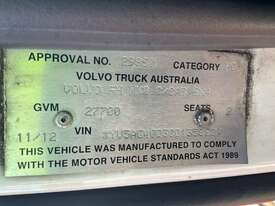 CP: 11/2012,Volvo,FH MK2,6x4 Prime Mover,Unknown,Airbag ,6 Cyl,Diesel,Turbo,Odometer not visible,Hourmeter not visible,Colour: White,Unregistered NSW,VIN: YV5AG40D3CD135862,GVM: 27700,Sold with No Plates,WOVR Status: Statutory Write-Off,Incident Type: Malicious