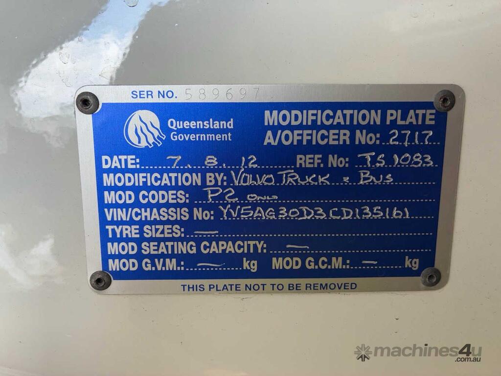 CP: 06/2012,Volvo,FH500 ,Prime Mover Sleeper Cab,Automatic,Airbag,6 Cyl,Diesel,1435082 (Kms. Showing on Odometer),27270 (Hrs. Showing on Hour meter),Colour: White,Unregistered,VIN: YV5AG30D3CD135161,Key No: 337,GVM: 27700,GCM: 70000,Sold with No Plates,Key No: 337