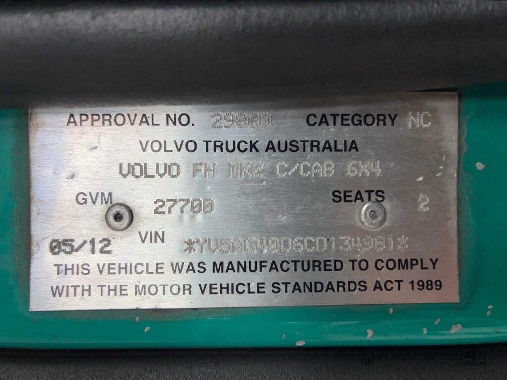 CP: 05/2012,Volvo,FH540,Prime Mover,Automatic,Airbag,6 Cyl,Diesel,1390310 (Kms. Showing on Odometer),Hourmeter not visible,Colour: Green,Unregistered,VIN: YV5AG40D6CD134981,Key No: 344,Length: 6800 undefined,GVM: 27700,GCM: 70000,Sold with No Plates,Key No: 344