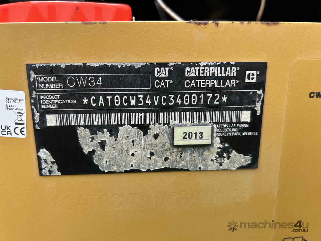 CP: CIRCA 2013,Caterpillar,CW34,Pneumatic Roller,4 Cyl,Diesel,Odometer not visible,8443 (Hrs. Showing on Hour meter),Colour: Yellow,Rego. No: 26881D NSW,VIN: CAT0CW34VC3400172,ROPS No: 3471-2008,FOPS No: 3449-2005,Sold with No Plates,Key No: 23