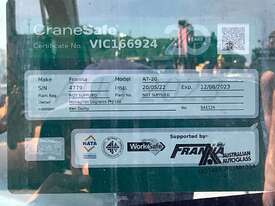 CP: CIRCA 2013,Franna,AT20,Pick & Carry Crane,Engine #: 906991C0984842,6 Cyl,Diesel Turbo,87118 (Kms. Showing on Odometer),9576 (Hrs. Showing on Hour meter),Colour: Blue,Rego. No: GJZ005 NSW,Rego expiry: 08/11/2025,Serial No: AT204779,Sold with No Plates,Key No: 394E