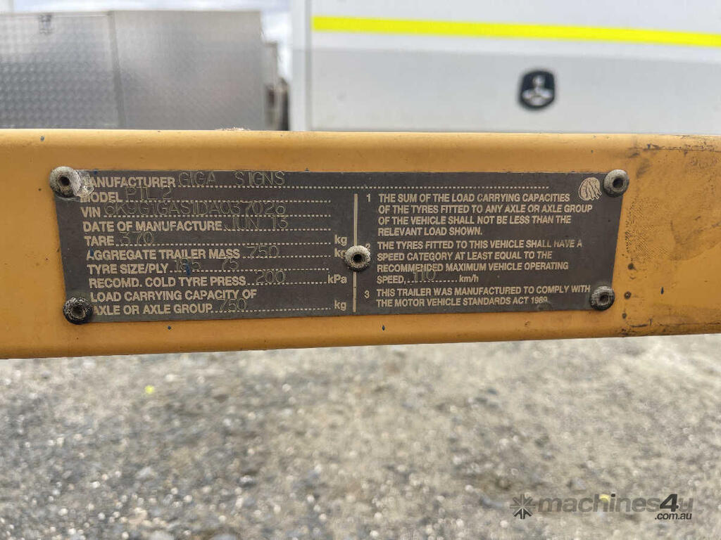CP: 06/2013,Built: 06/2013,Giga Signs,PTL2,Single Axle Traffic Light Trailer Combination,0 (undefined),Unregistered,VIN: 6K9G1GAS1DA037027,Sold with No Plates