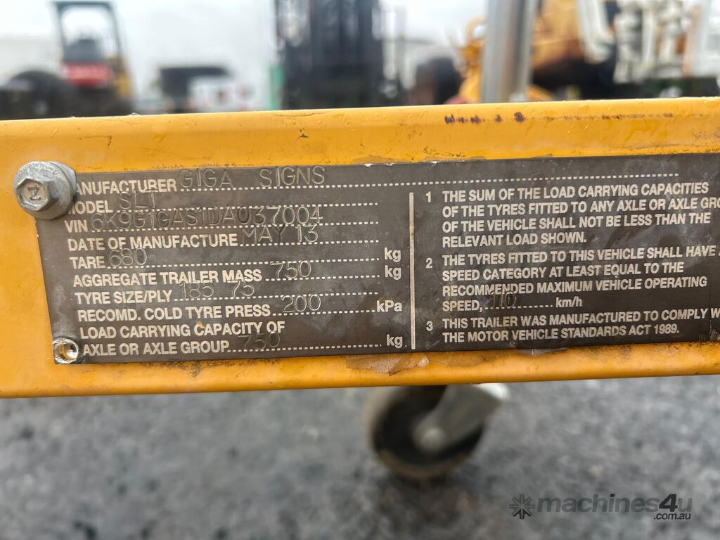 CP: 05/2013,Giga Signs,Trailer Mounted Light Tower,Odometer not visible,Hourmeter not visible,Colour: Yellow,Unregistered,VIN: 6K9G1GAS1DA037004,Sold with No Plates