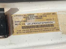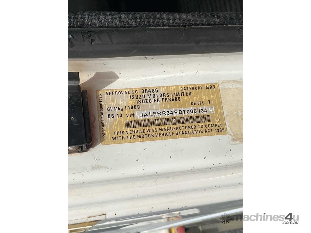 CP: 06/2013,Isuzu,FRR600,Crew Cab Table Top,Manual,Spring,Sitec,6 Cyl,Diesel Turbo,6 Gears,100584 (Kms. Showing on Odometer),6026 (Hrs. Showing on Hour meter),Colour: White,Unregistered,VIN: JALFRR34PD7000134,Key No: 1S,Length: 9.4 m,GVM: 11000,GCM: 16000,Sold with No Plates,Key No: 1S