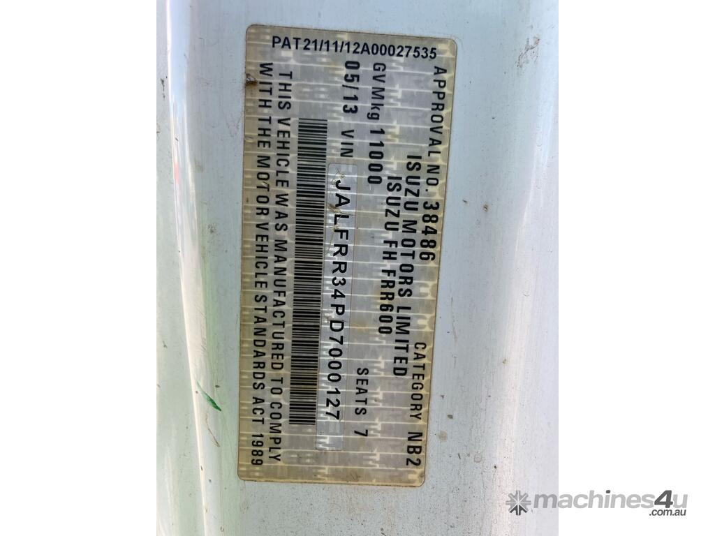 CP: 05/2013,Isuzu,FRR600,Table Top,Manual,Leaf Springs,Diesel,Turbo,6 Gears,203714 (Kms. Showing on Odometer),Hourmeter not visible,Colour: White,Unregistered NAT,VIN: JALFRR34PD7000127,GVM: 11000,GCM: 16000,Sold with No Plates