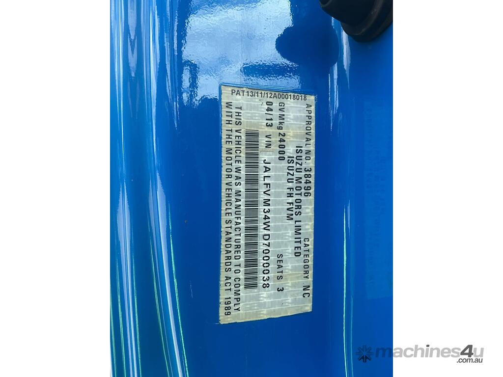 CP: 04/2013,Isuzu,FVL 1400 LWB,Curtainsider,Manual,Air Bag Suspension,6 Cyl,Diesel,334721 (Kms. Showing on Odometer),10281 (Hrs. Showing on Hour meter),Colour: Blue,Rego. No: NP(XV21HL), Unregistered VIC,VIN: JALFVM34WD7000038,Key No: 91,GVM: 24000,GCM: 32000,Sold with No Plates,Key No: 91