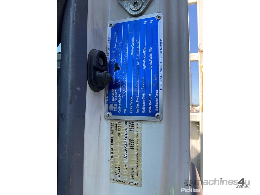 CP: 06/2013,Isuzu,FXZ1500,Table Top Beaver Tail,Automatic,Spring ,6 Cyl,Diesel,Turbo,334140 (Kms. Showing on Odometer),15643 (Hrs. Showing on Hour meter),Colour: White,Rego. No: XP42AP NSW,Rego expiry: 21/11/2025,VIN: JALFXZ77UD7000071,Key No: 230,Length: 9.8 m,GVM: 24000,GCM: 42500,Sold with No Plates,Key No: 230