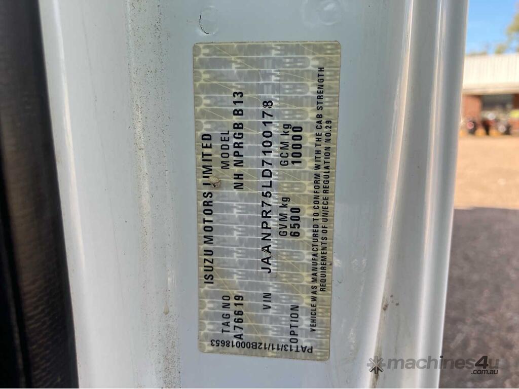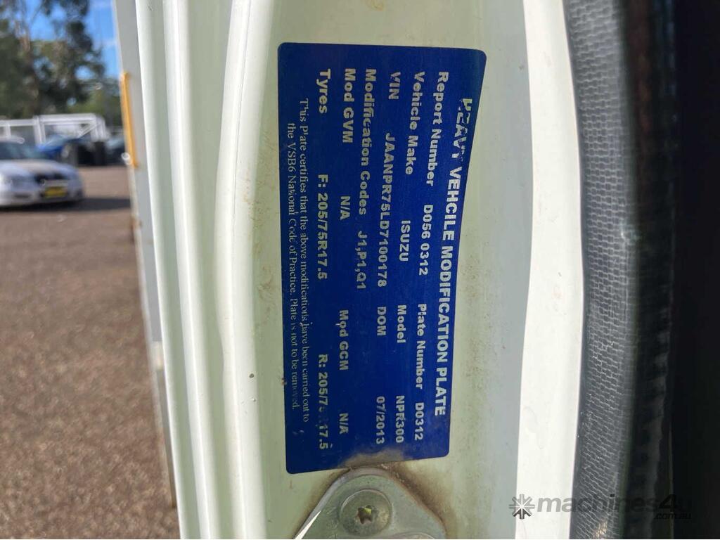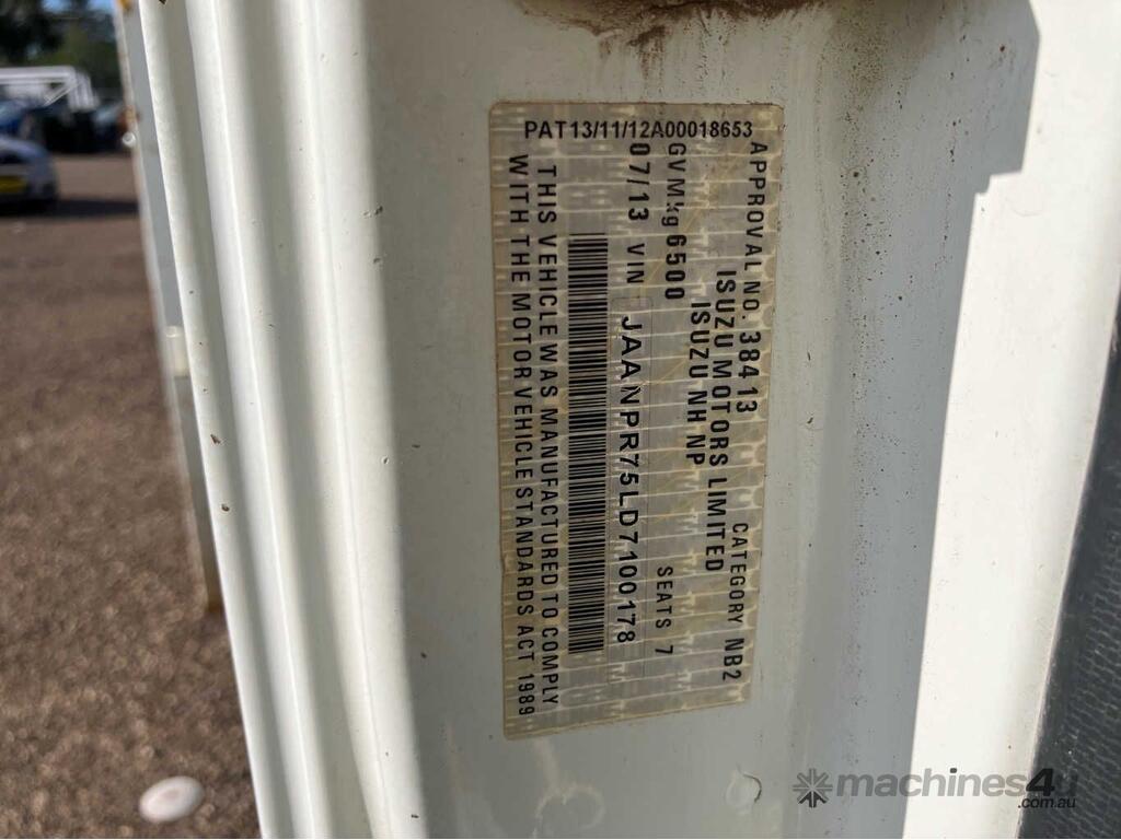 CP: 07/2013,Isuzu,NPR300,Crew Cab Tray,Manual,Leaf Spring Suspension ,Engine #: 4HK1123653,Isuzu 4HK1,4 Cyl,Diesel,6 Gears,130625 (Kms. Showing on Odometer),Hourmeter not visible,Colour: White,Rego. No: NP(ZXK258), Unregistered VIC,VIN: JAANPR75LD7100178,Key No: 26,Length: 7.6 m,GVM: 6500,GCM: 10000,Sold with No Plates,Key No: 26