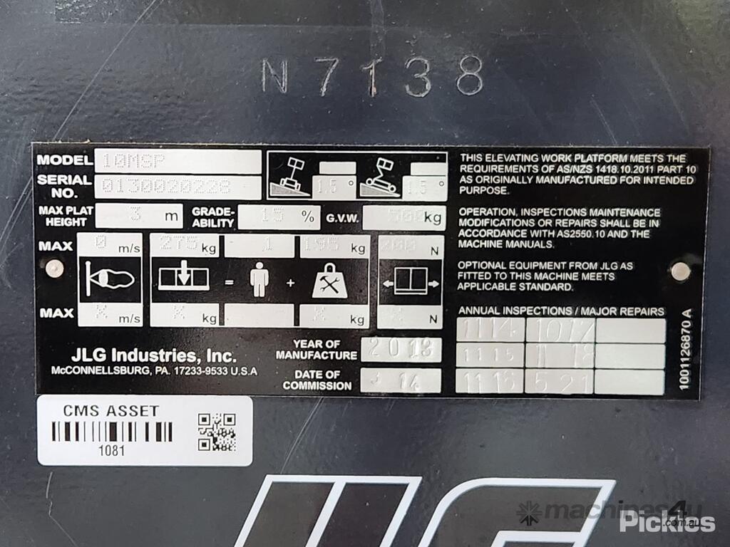 CP: CIRCA 2013,JLG Industries,10MSP,Electric Reach Forklift (Stand on),Electric,Odometer not visible,88 (Hrs. Showing on Hour meter),Colour: Grey,Unregistered,Serial No: ,Sold with No Plates