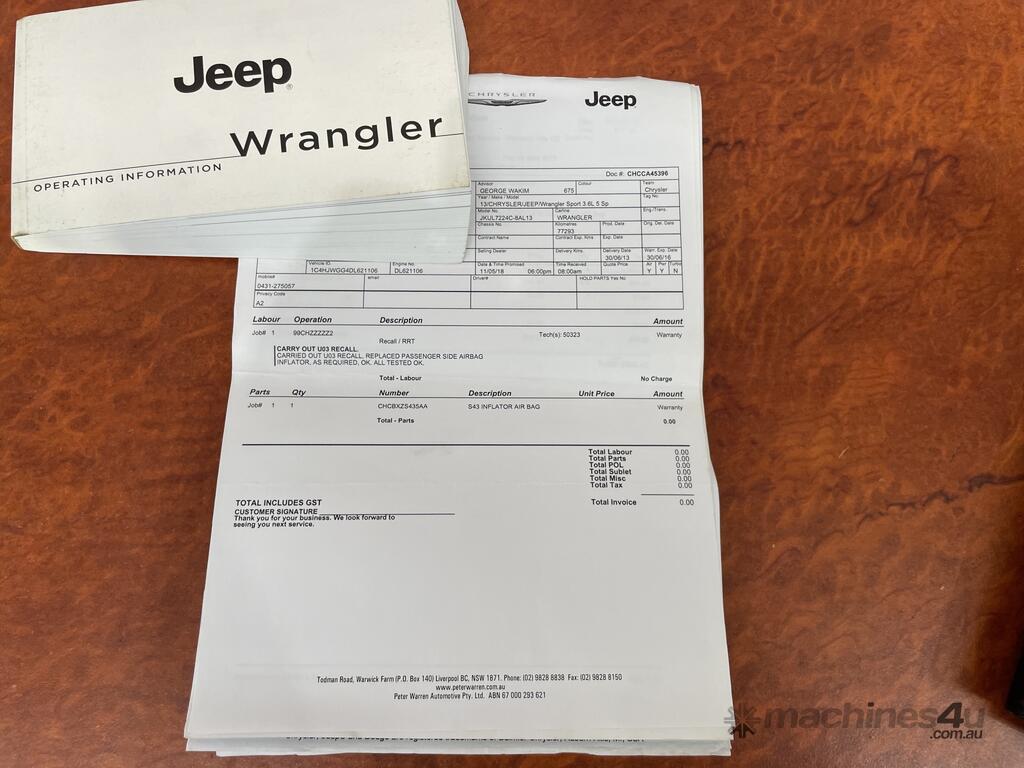 2013 JEEP WRANGLER SPORT JK AUTO AWD PETROL SUV - WITH FRAME 3604cc 209kw 5sp 6cyl 2dr 4seat