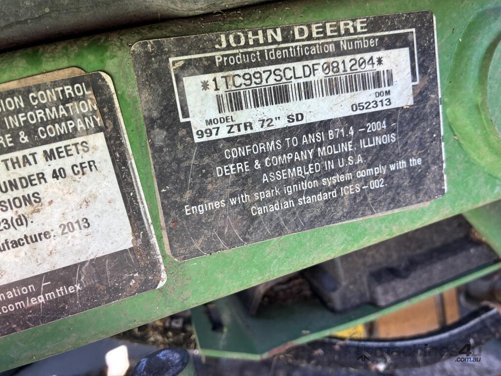 CP: CIRCA 2013,Built: 05/2013,John Deere,997 Z-Track,Zero Turn Ride On Mower,1300 CC,3 Cyl,Diesel,2 Gears,Odometer not visible,1305 (Hrs. Showing on Hour meter),Colour: Green,Unregistered,Serial No: 1TC997SCLDF081204,ROPS No: undefined,Sold with No Plates