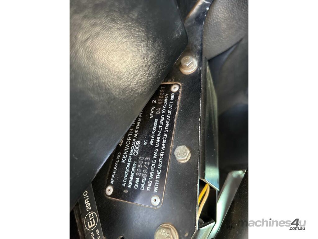 CP: 09/2013,Kenworth,C509,Prime Mover Sleeper Cab,Automatic,Spring Suspension ,6 Cyl,Diesel Turbo,702329 (Kms. Showing on Odometer),26165 (Hrs. Showing on Hour meter),Colour: White,Unregistered,VIN: 6F5000000DA450297,Key No: 42,Length: 8.8 undefined,GVM: 26500,GCM: 155000,Sold with No Plates,Key No: 42