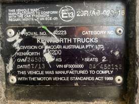 CP: 07/2013,Built: 07/2013,Kenworth,K200 Series,6x4 Sleeper Cab Prime Mover,Manual,18 Gears,Odometer not visible,Hourmeter not visible,Colour: White,Rego. No: NP(XB72LI), Unregistered NAT,VIN: 6F5000000DA450112,GVM: 26500,GCM: 97000,Sold with No Plates,WOVR Status: WOVR N/A,Incident Type: Impact