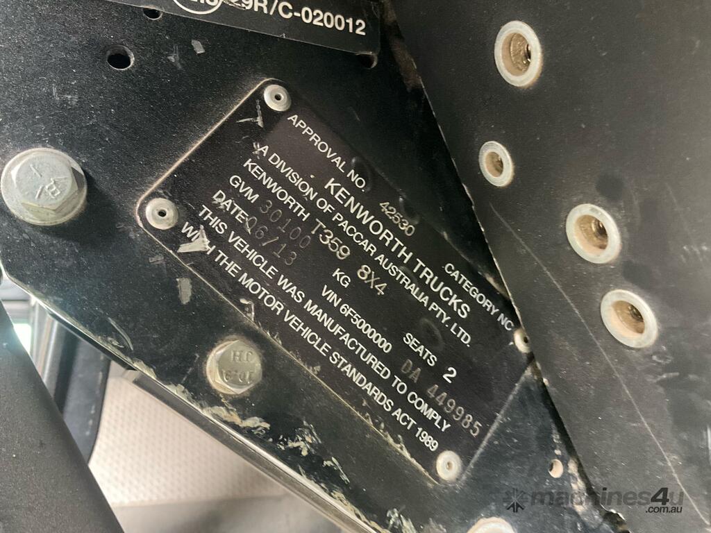 CP: 06/2013,Kenworth,T359,Tipper,Manual,Airbag,Engine #: 35312817,Cummins ISME5,6 Cyl,Diesel Turbo,18 Gears,996958 (Kms. Showing on Odometer),26721 (Hrs. Showing on Hour meter),Colour: Grey,Rego. No: TPN095 NSW,Rego expiry: 10/12/2025,VIN: 6F5000000DA449985,Key No: 109,GVM: 30100,GCM: 50000,Sold with No Plates,Key No: 109