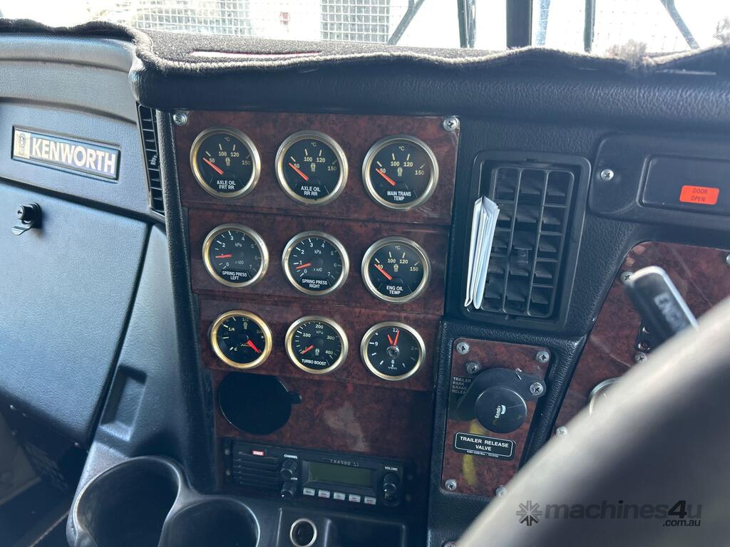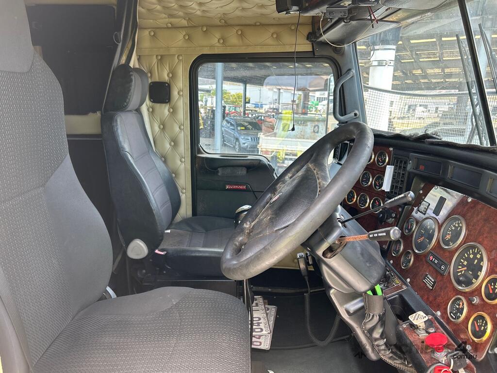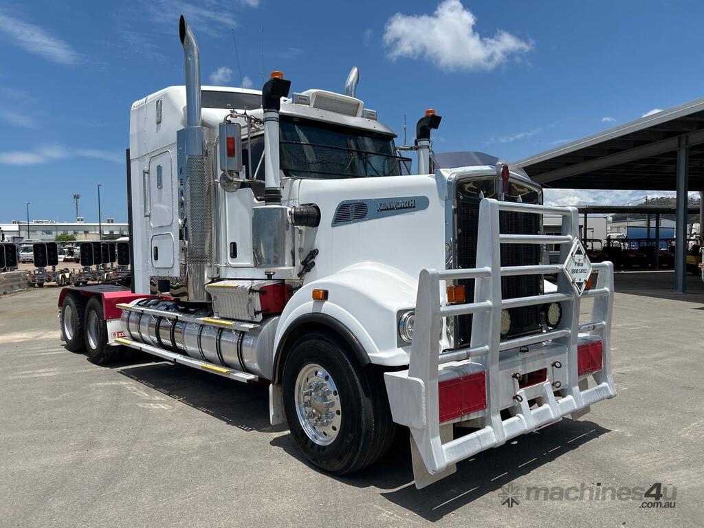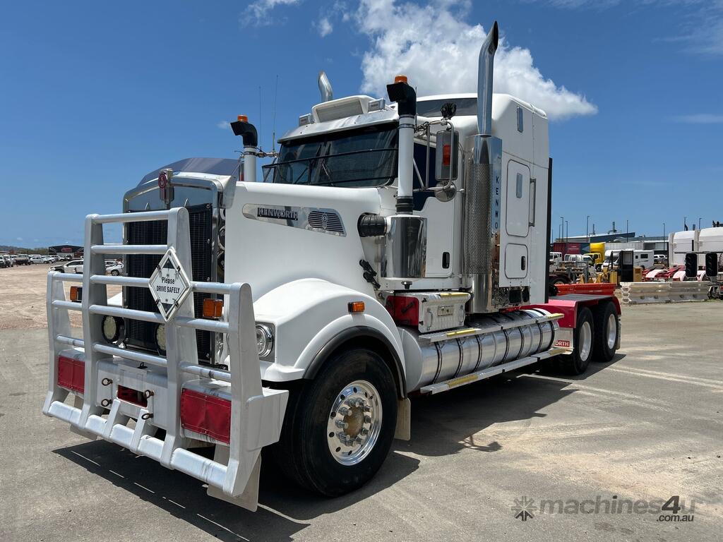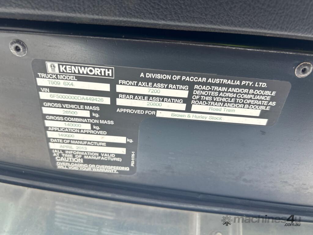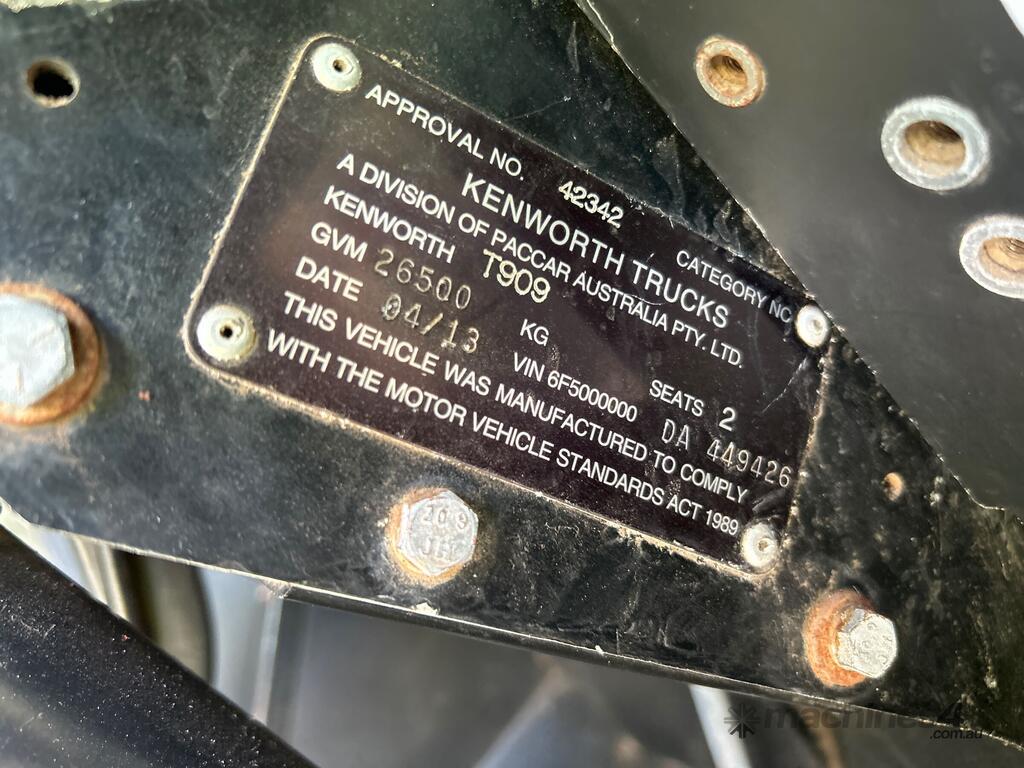 CP: 04/2013,Kenworth,T909,Prime Mover,Manual,Airbag Suspension,Cummins X15 550 HP,14.9 Ltr,6 Cyl,Diesel Turbo,18 Gears,718000 (Kms. Showing on Odometer),31145 (Hrs. Showing on Hour meter),Colour: White,Rego. No: NP(846TES), Unregistered QLD,VIN: 6F5000000DA449426,GVM: 26500,GCM: 140000,Sold with No Plates