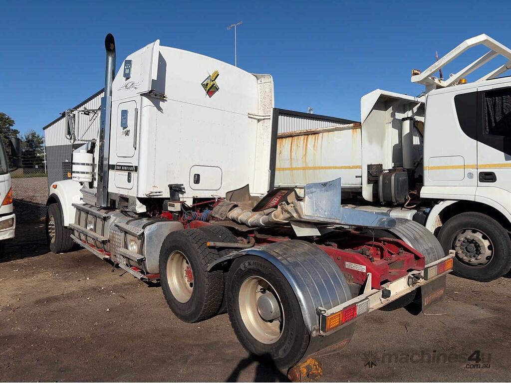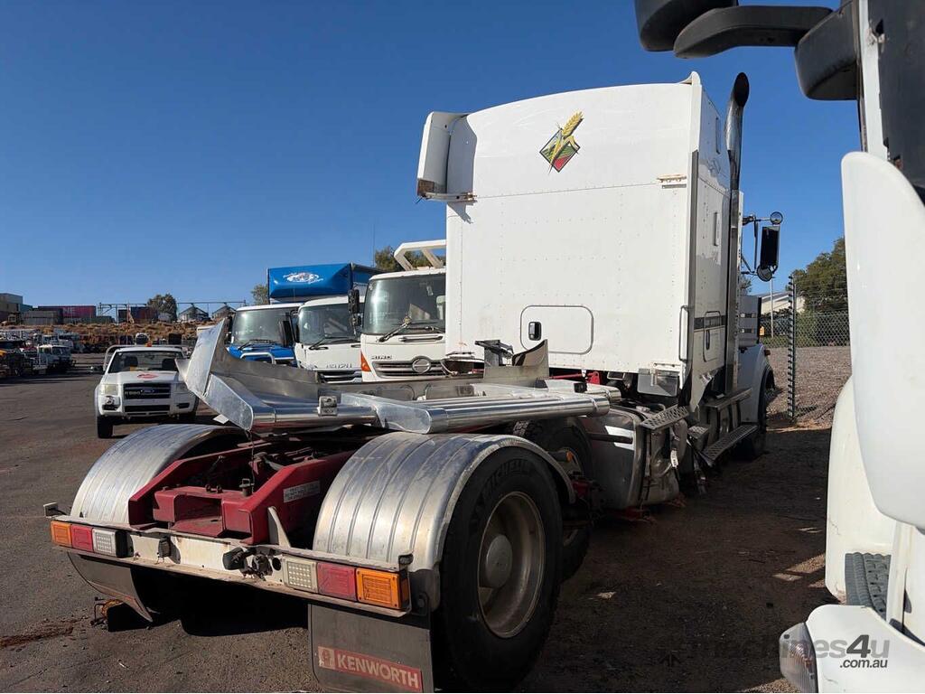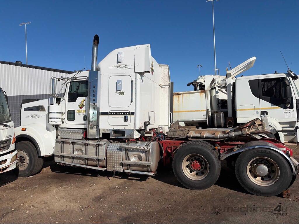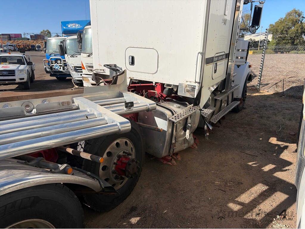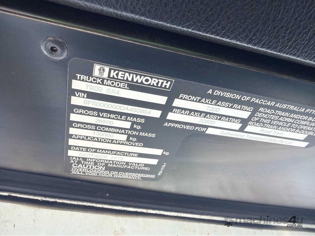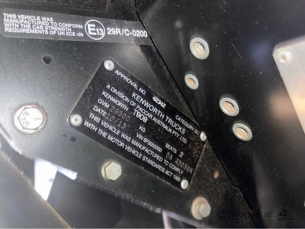 CP: 10/2013,Kenworth,T909,Prime Mover,Manual,Airbag,Engine #: 79792473,ISX E5,6 Cyl,Diesel Turbo,18 Gears,Odometer not visible,Hourmeter not visible,Colour: White,Rego. No: NP(1HOU207), Unregistered WA,VIN: 6F5000000DA450804,Length: 8 m,GVM: 26500,GCM: 130000,Sold with No Plates,WOVR Status: WOVR N/A,Incident Type: Impact