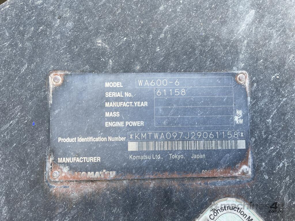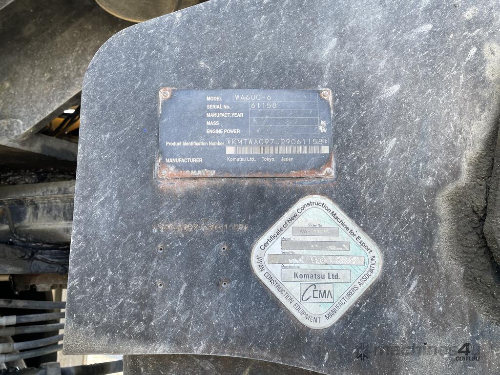 CP: CIRCA 2013,Built: 11/2013,Komatsu,WA600-6,Front End Loader,Engine #: 513563,6 Cyl,Diesel Turbo,239455 (Kms. Showing on Odometer),37994 (Hrs. Showing on Hour meter),Colour: Yellow,Unregistered,Chassis: 61158,Serial No: KMTWA097J29061158,Sold with No Plates