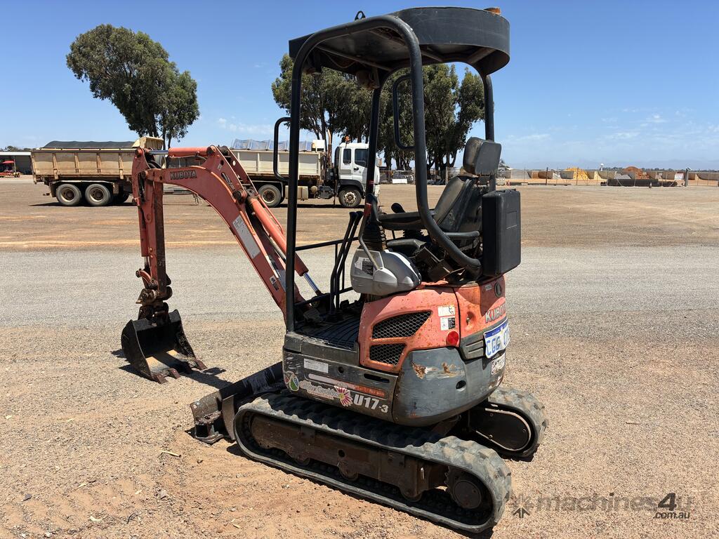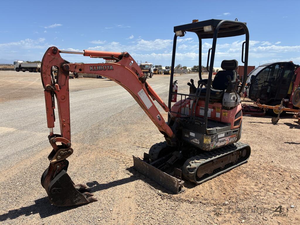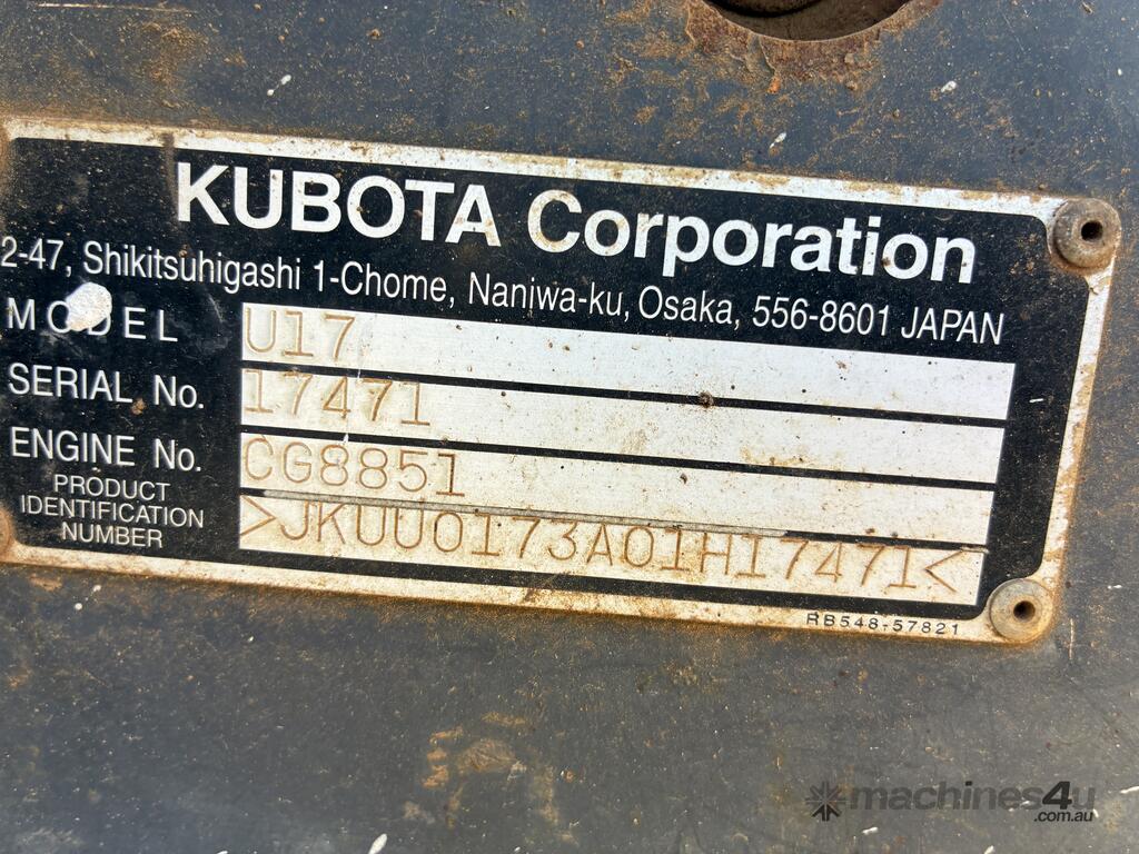 CP: CIRCA 2013,Kubota,U17,Excavator (Rubber Tracked),3 Cyl,Diesel,Odometer not visible,2209 (Hrs. Showing on Hour meter),Rego. No: NP(CGG4775), Unregistered WA,VIN: JKUU0173A01H17471,Serial No: 17471,Sold with No Plates