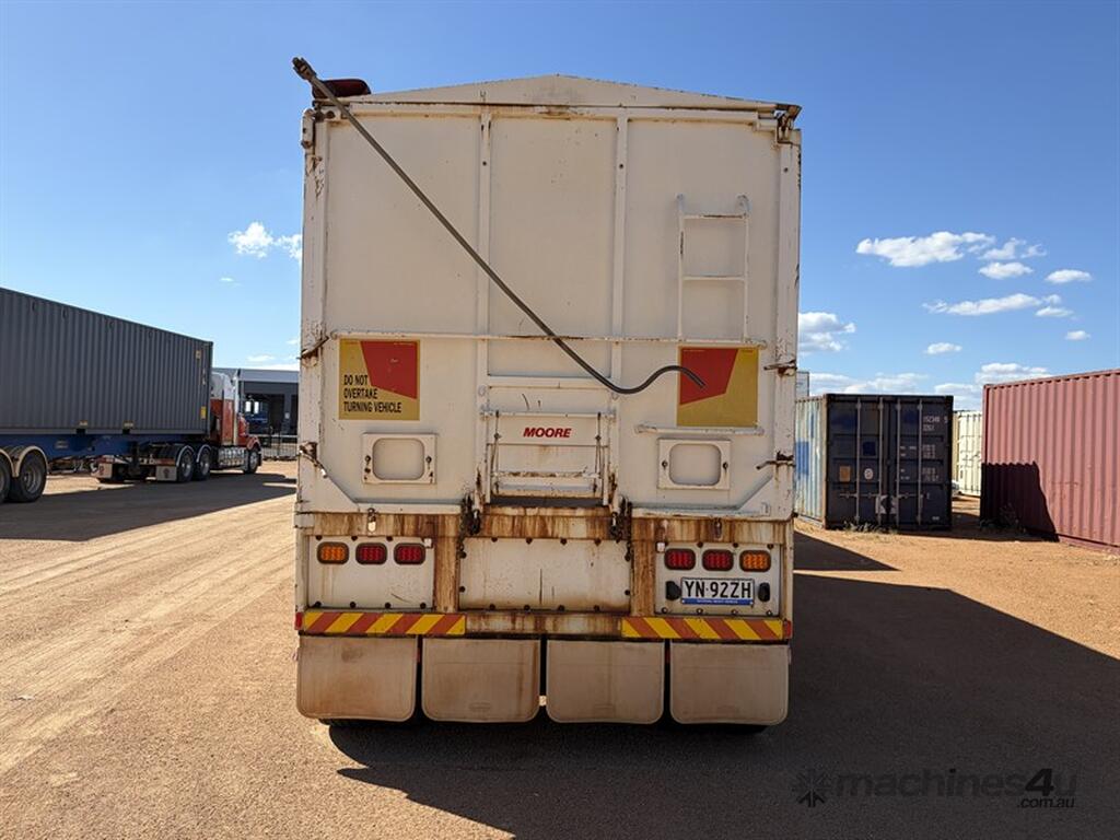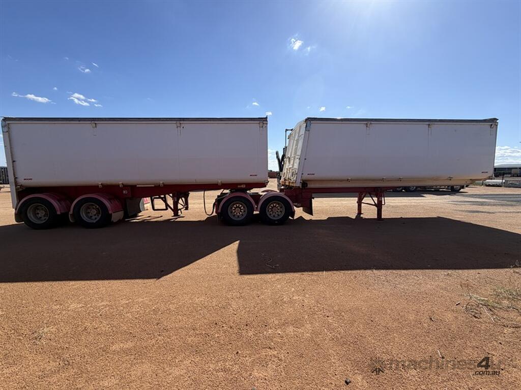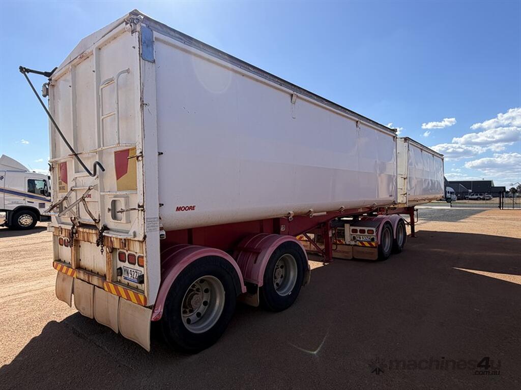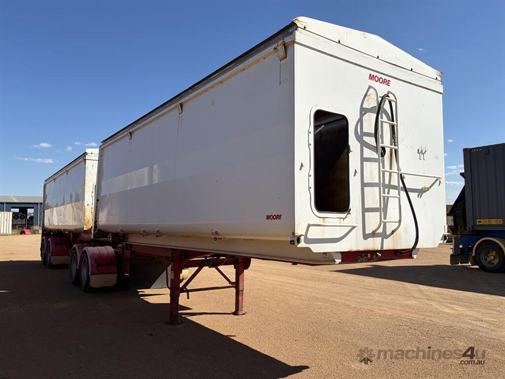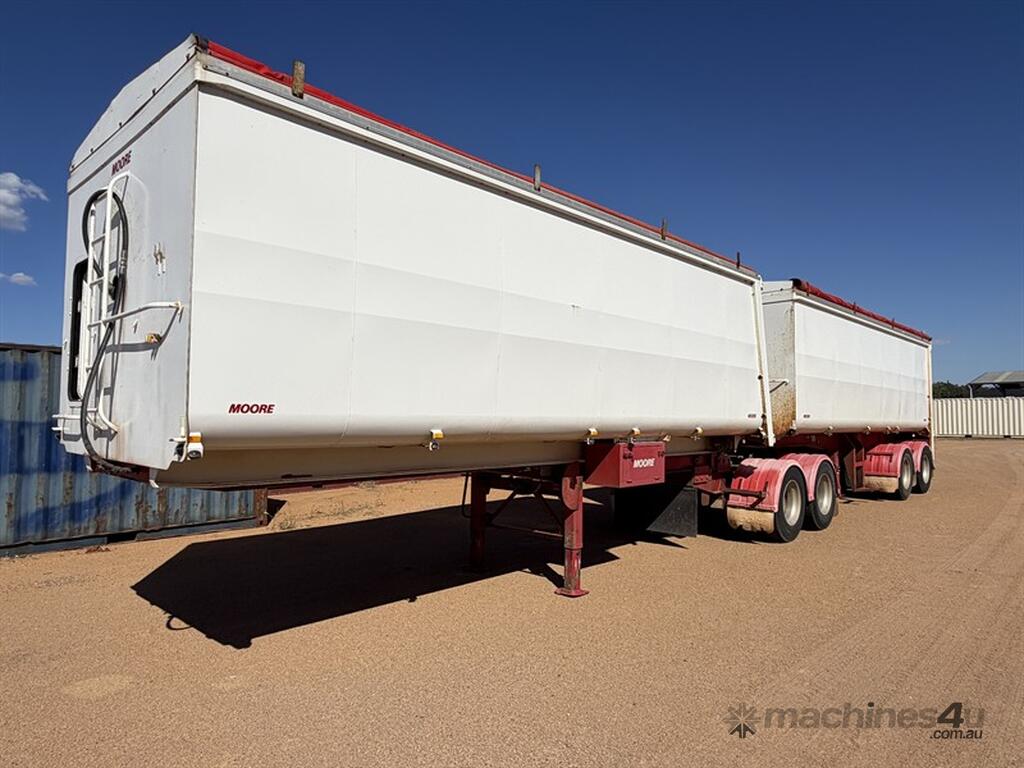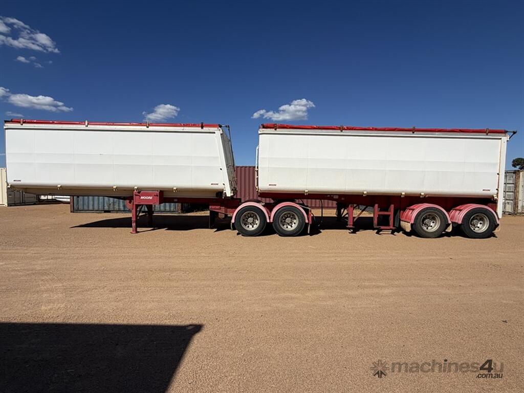 2013 MOORE 19M B-DOUBLE TIPPERS, A-trailer VIN: 6V9LMTSMTDP002157, B-trailer VIN: 6V9LMTSMTDP002158, sliding A-trailer with 6.8m body, TOA B-trailer with 7.62m body, 1820mm sides, roll over tarps, submarine doors, Hendrickson axles, airbag suspension, 3 way tailgates with grain doors, last registered Feb 2026, whole unit presents well, located Dubbo