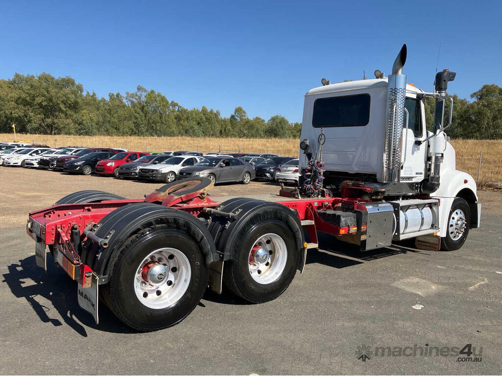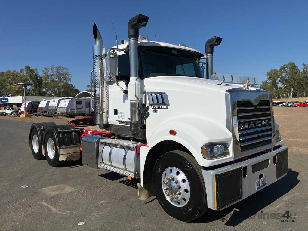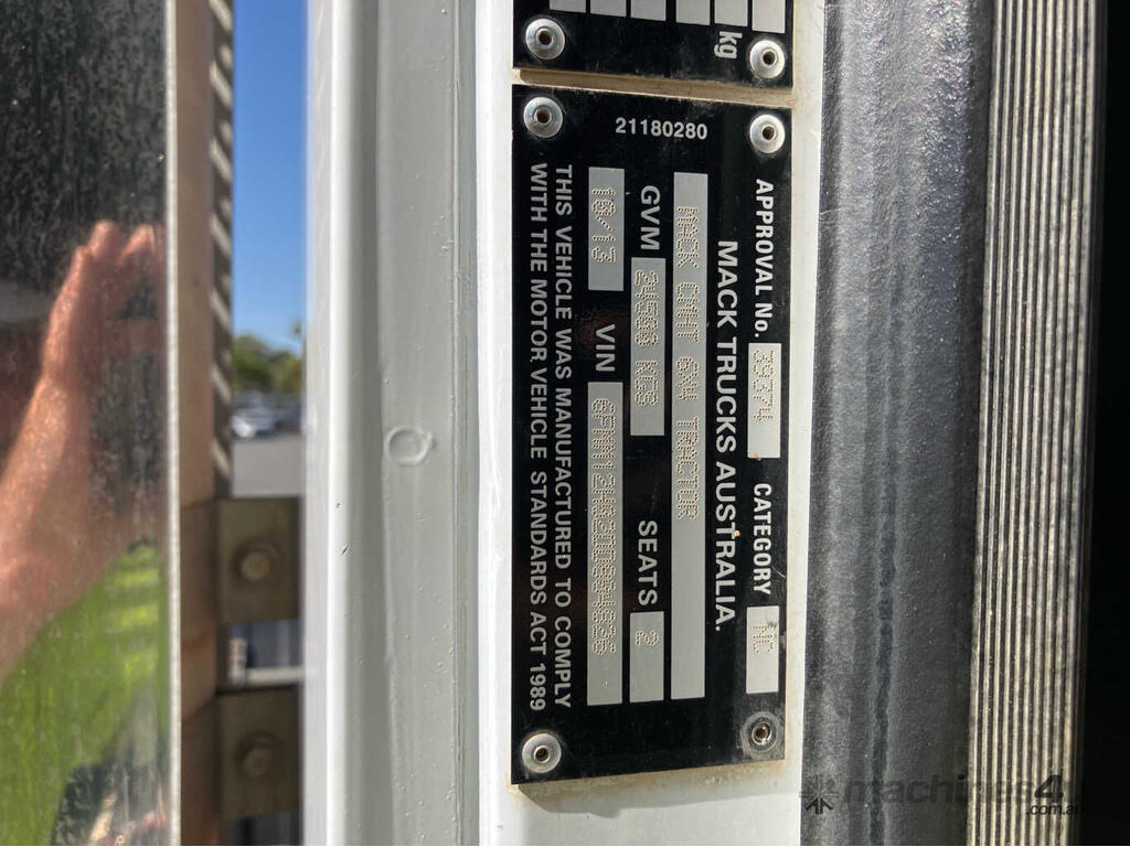 CP: 10/2013,Mack,CMHT Trident,Prime Mover,Automatic,Air bag Suspension ,Engine #: 416131,Mack MP8,6 Cyl,Diesel,307223 (Kms. Showing on Odometer),9010 (Hrs. Showing on Hour meter),Colour: White,Rego. No: XN14SY NAT,Rego expiry: 15/09/2026,VIN: 6FMM12H02DD804826,Key No: 46,Length: 7.75 m,GVM: 24500,GCM: 70000,Sold with No Plates,Key No: 46