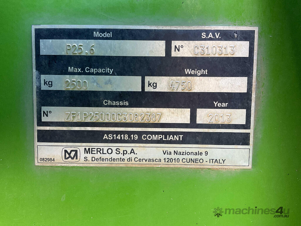CP: CIRCA 2013,Merlo,P25.6,Telehandler,Engine #: CC1906,4 Cyl,Diesel Turbo,Odometer not visible,3986 (Hrs. Showing on Hour meter),Colour: Green,Unregistered,Serial No: ZF1P25000C3082387,Sold with No Plates,Key No: 162E
