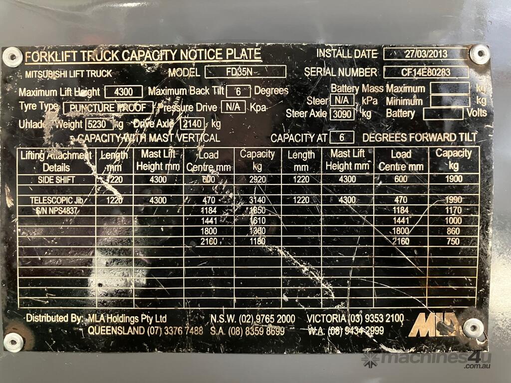Available for immediate sale is this Mitsubishi FD35N 3.5 tonne diesel forklift, part of Mitsubishi’s globally recognised FD-N Series industrial forklift range.