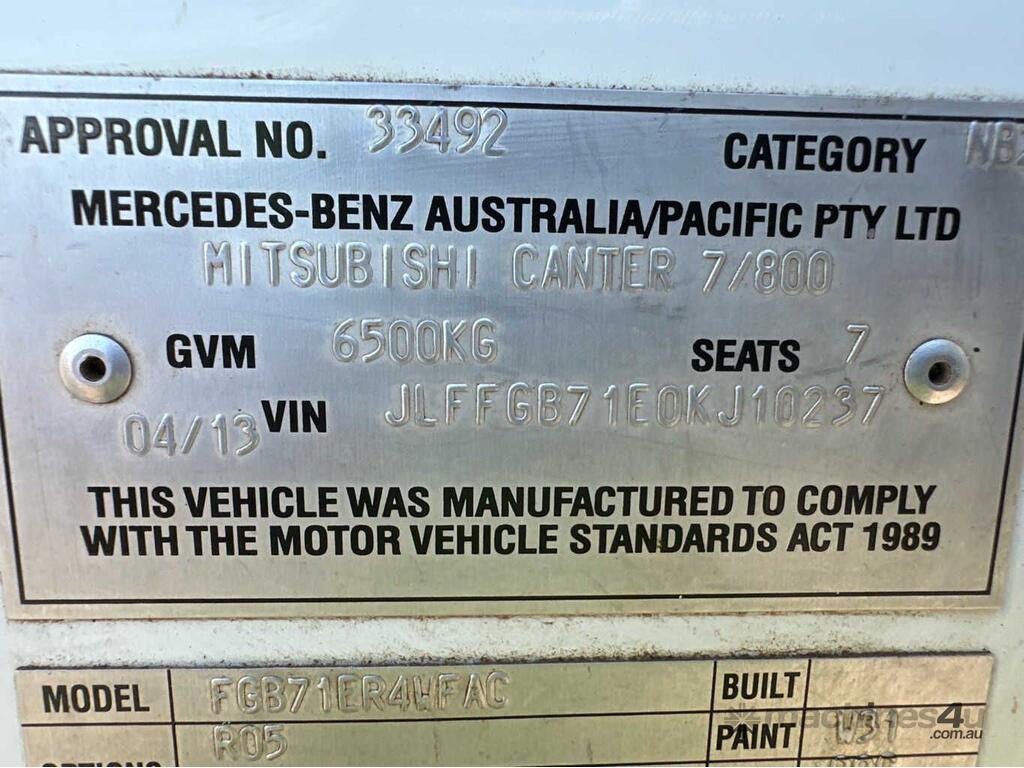 CP: 04/2013,Mitsubishi Fuso,Canter 7/800,Tipper,Manual,Spring,Engine #: 4P10A79295,Fuso 4P10-7AT4,4 Cyl,Diesel,5 Gears,168561 (Kms. Showing on Odometer),Hourmeter not visible,Colour: White,Unregistered,VIN: JLFFGB71E0KJ10237,Key No: 71,Length: 6.3 m,GVM: 6500,GCM: 10000,Sold with No Plates,Key No: 71