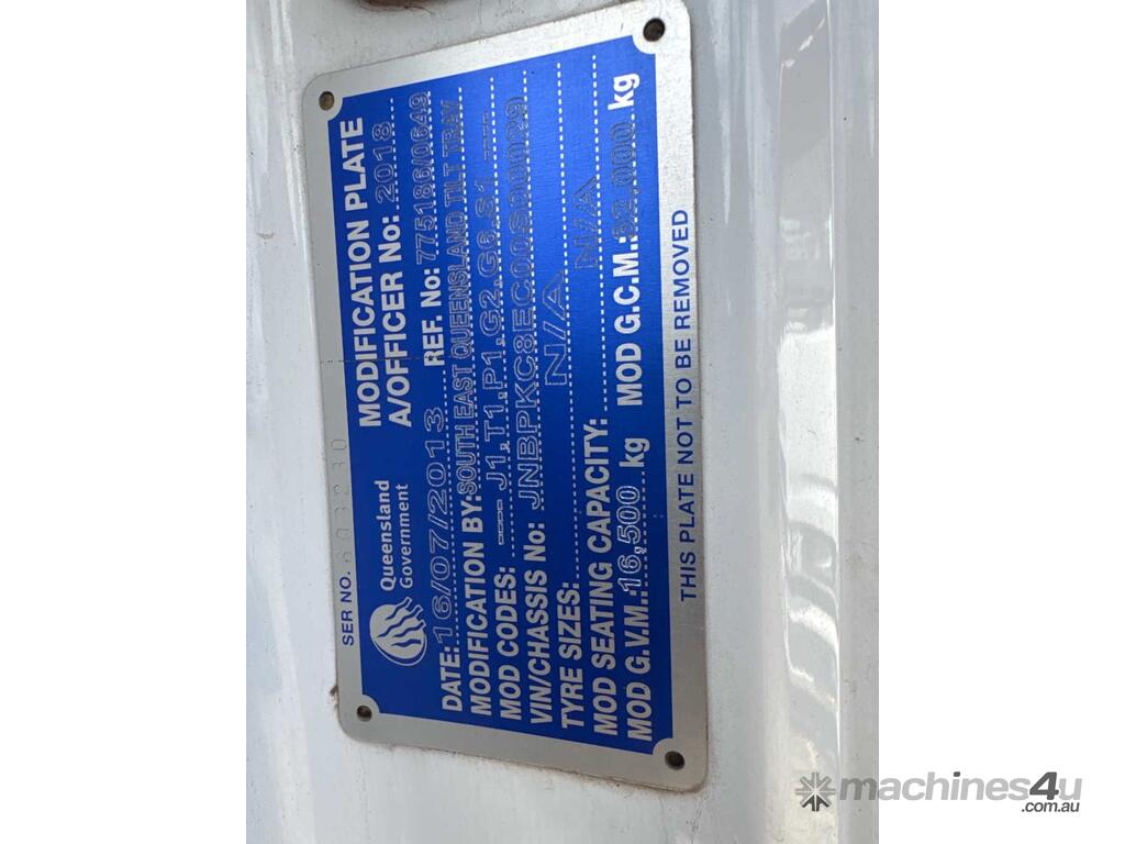 CP: 01/2013,Nissan UD,Condor PK17 280,Tilt Tray,Manual,Airbag,Diesel,Odometer not visible,Hourmeter not visible,Colour: White,Rego. No: NP(665TFS), Unregistered QLD,VIN: JNBPKC8EC00S00029,Length: 10 M,GVM: 16500,GCM: 20500,Sold with No Plates,WOVR Status: WOVR N/A,Incident Type: Impact