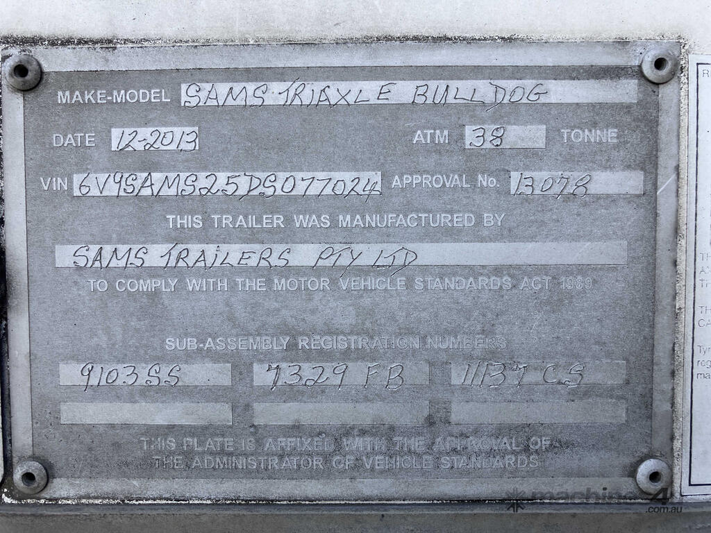 CP: CIRCA 2013,Built: 12/2013,Sams Trailers,Bulldog,Tri Axle,Pantech,754822 (Kms. Showing on Hubometer),Colour: White,Rego. No: NP(YN15YP), Unregistered NAT,VIN: 6V9SAMS25DS077024,Serial No: NULL,Sold with No Plates,WOVR Status: Repairable Write-Off,Incident Type: Impact