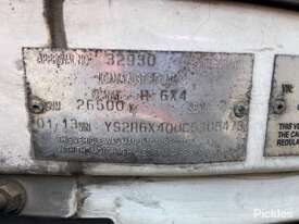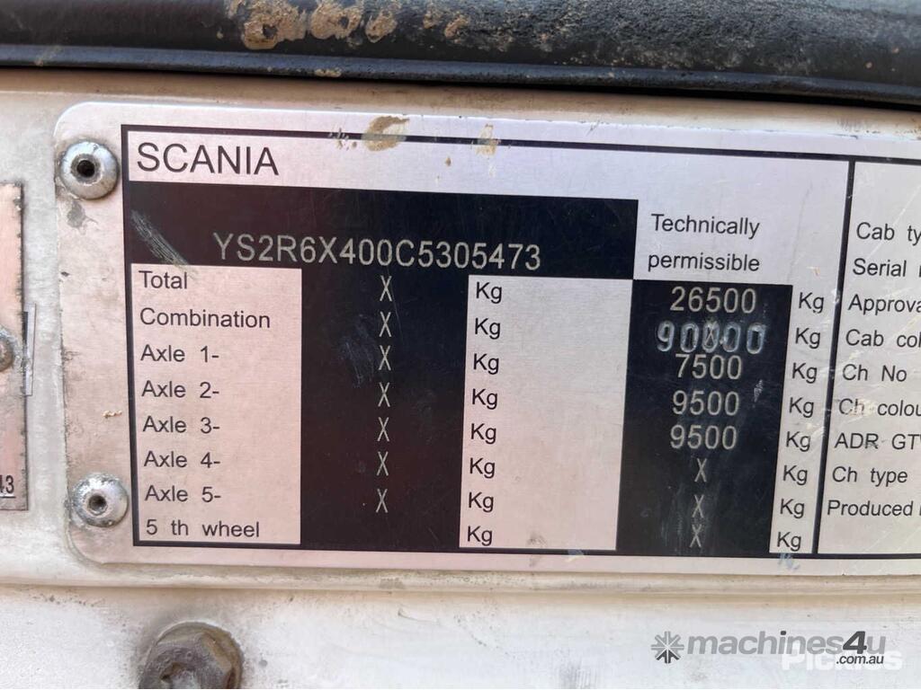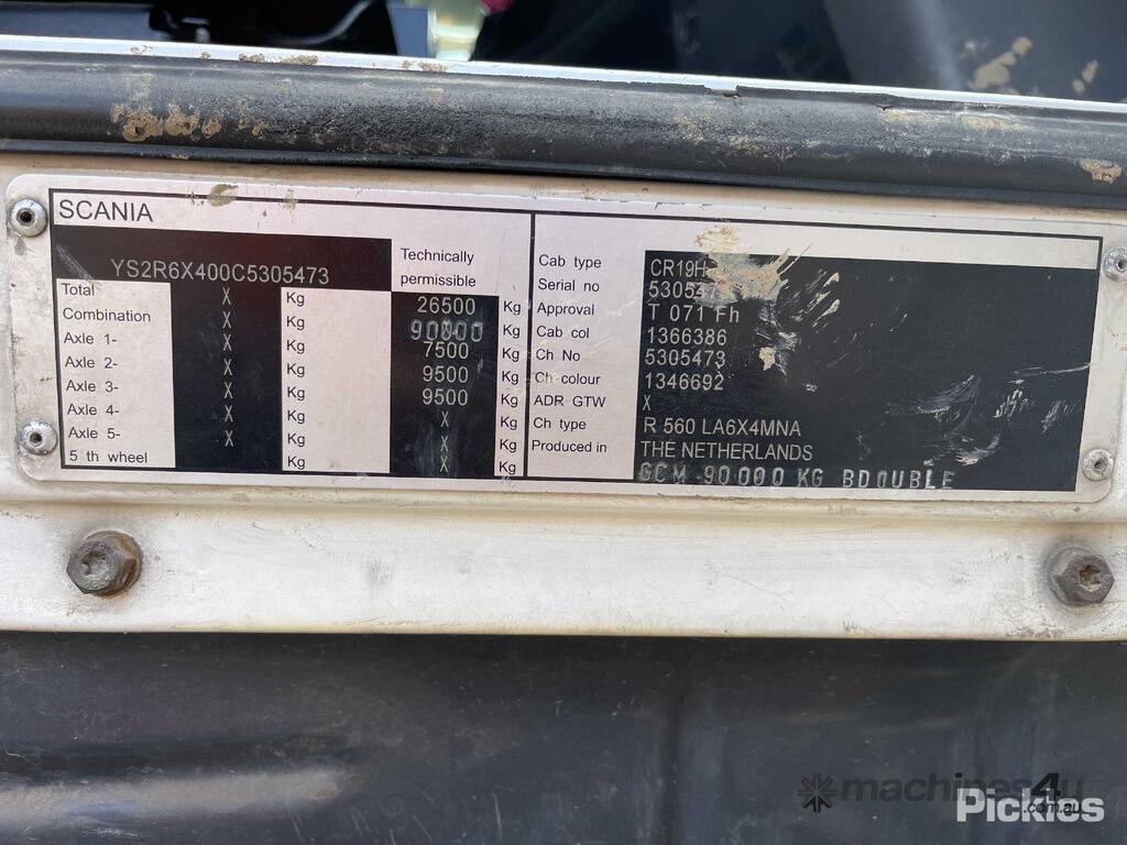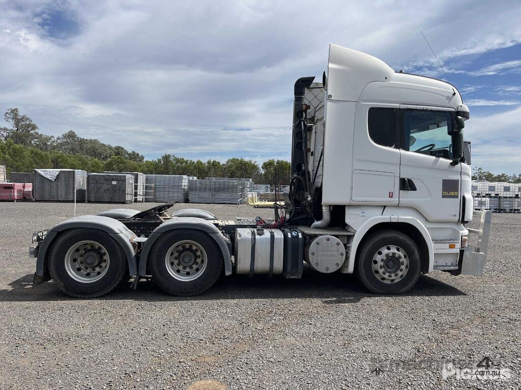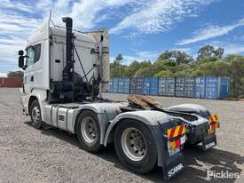 CP: 01/2013,Scania,R560,Prime Mover,Automatic,Airbag ,8 Cyl,Diesel,740743 (Kms. Showing on Odometer),487 (Hrs. Showing on Hour meter),Colour: White,Rego. No: NP(XN50TY), Unregistered NAT,VIN: YS2R6X400C5305473,GVM: 26500,GCM: 90000,Sold with No Plates