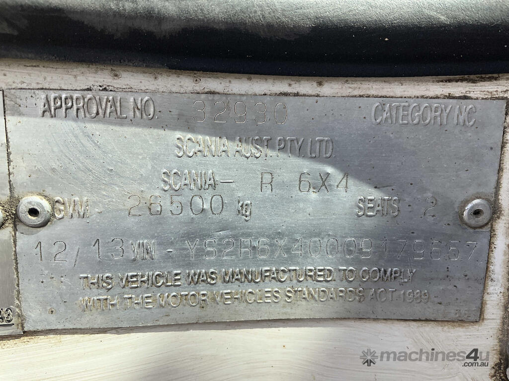 CP: 12/2013,Scania,R560,Tipper Day Cab,Airbag,Engine #: 1106348,Euro 5,8 Cyl,Diesel,1345035 (Kms. Showing on Odometer),Hourmeter not visible,Colour: White,Rego. No: NP(XP92JY), Unregistered NSW,VIN: YS2R6X7,Key No: 509S,Length: 7.4 m,GVM: 26500,GCM: 75000,Sold with No Plates,Key No: 509S