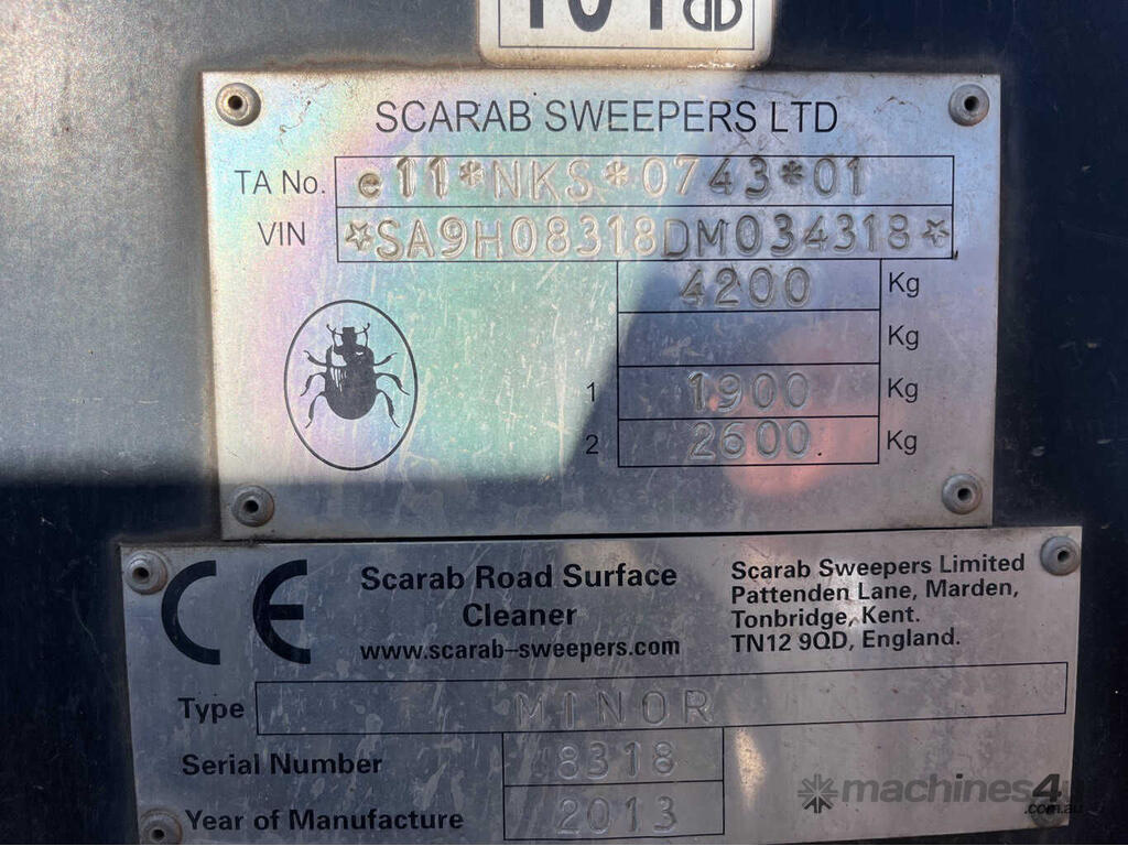 CP: CIRCA 2013,Scarab,Minor,Sweeper,4 Cyl,Diesel,7120 (Kms. Showing on Odometer),1295 (Hrs. Showing on Hour meter),Colour: White,Rego. No: NP(22478C), Unregistered,VIN: SA9H08318DM034318,Serial No: 8318,Sold with No Plates