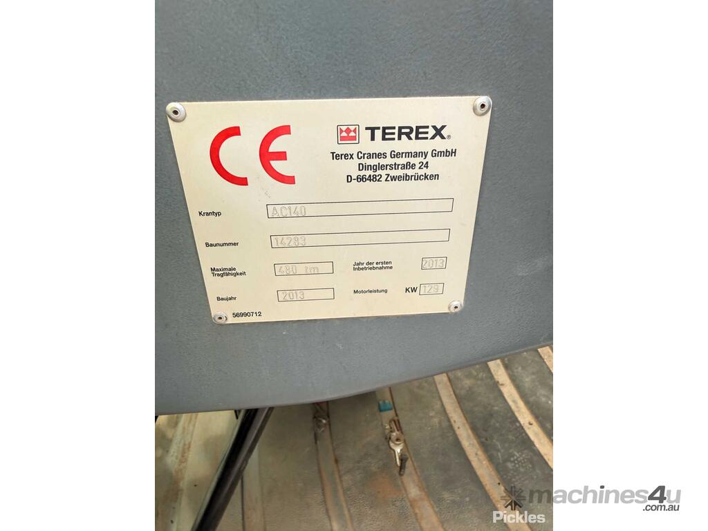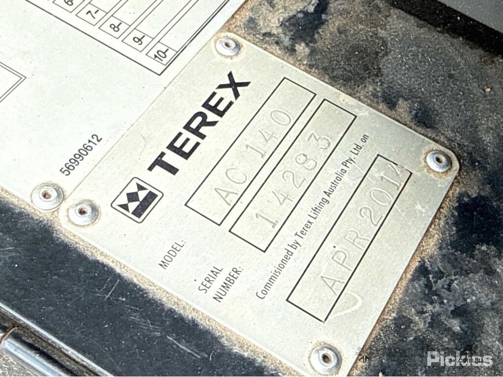CP: CIRCA 2013,Terex Demag,AC140,All Terrain Crane,8 Cyl,Diesel Turbo,83070 (Kms. Showing on Odometer),3789 (Hrs. Showing on Hour meter),Colour: White,Rego. No: NP(974WZP), Unregistered QLD,Serial No: WMG5316H0DZ000283,Sold with No Plates