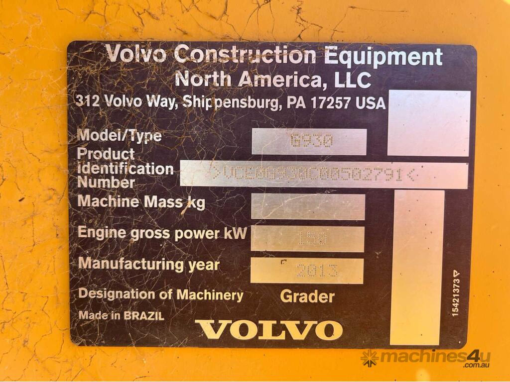 CP: CIRCA 2013,Built: 01/2013,Volvo,G930,Grader,Engine #: 11399255,Diesel,Turbo,Odometer not visible,10744 (Hrs. Showing on Hour meter),Colour: Yellow,Rego. No: NP(ZND407), Unregistered,VIN: VCE0G930C00502791,Sold with No Plates