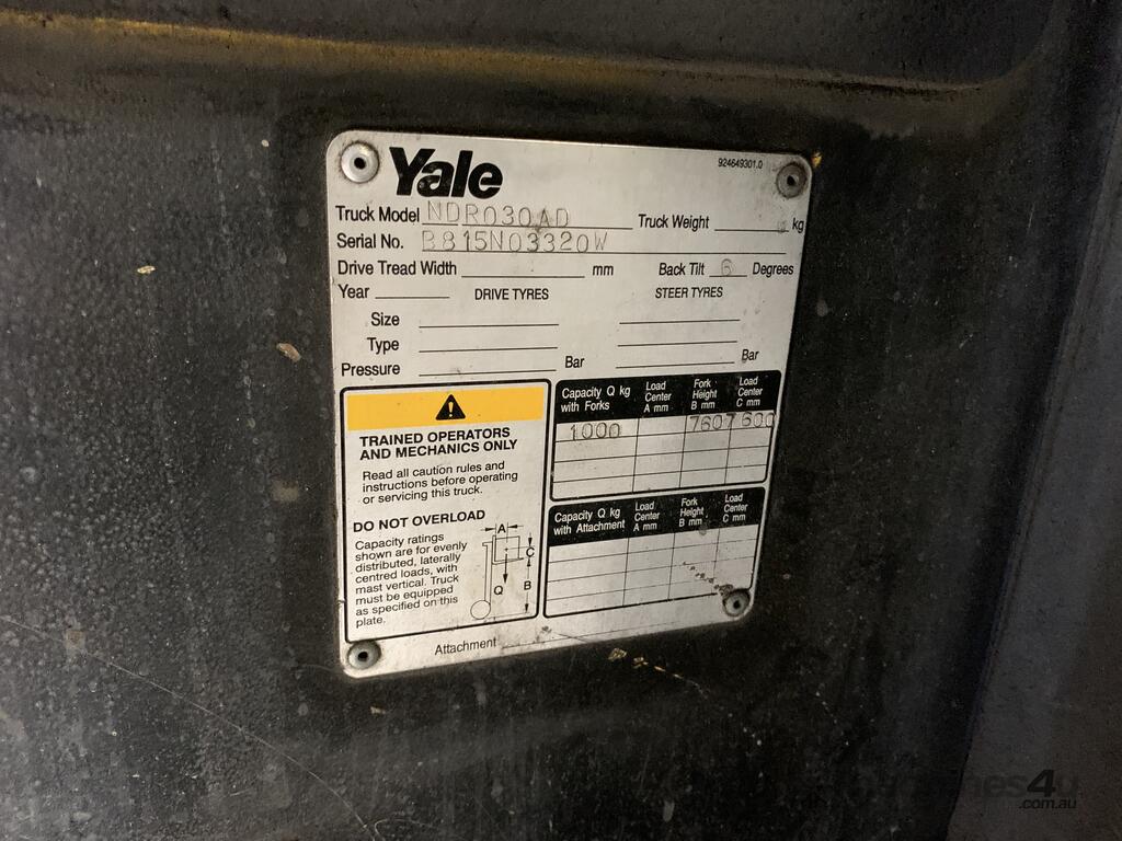 CP: 09/2013,Yale,NDR030AD,Reach Stacker,Electric,Odometer not visible,4878 (Hrs. Showing on Hour meter),Colour: Yellow,Unregistered,Serial No: B815N03320W,Sold with No Plates