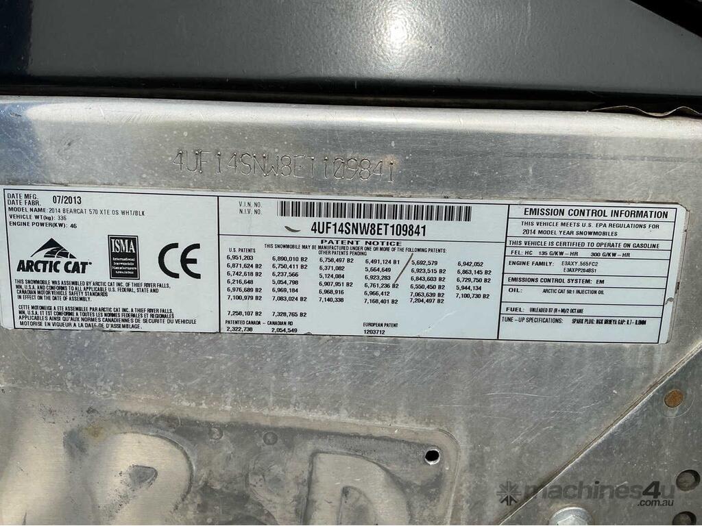 CP: CIRCA 2014,Built: 07/2013,Arctic Cat,Bearcat 570 XTE OS,Snow Mobile,565 CC,2 Cyl,2 Stroke,Odometer not visible,Hourmeter not visible,Colour: Black,Unregistered NSW,VIN: 4UF14SNW8ET109841,Sold with No Plates