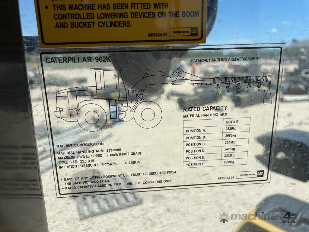 CP: CIRCA 2014,Caterpillar,962K,Articulated Wheel Loader,Diesel,Odometer not visible,7255 (Hrs. Showing on Hour meter),Colour: Yellow,Unregistered,Serial No: CAT0962KCFLL00316,Sold with No Plates