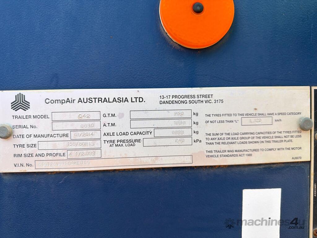 CP: 01/2014,Compair,C42,Air Compressor,Odometer not visible,Hourmeter not visible,Unregistered,Chassis: 2232609,Serial No: 6T9T26V97E0AKE005,Sold with No Plates
