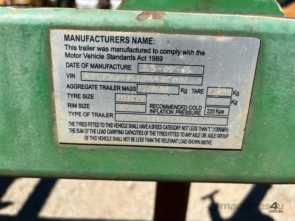 CP: 05/2014,Built: 05/2014,Custom Made,Single Axle Tilting Plant Trailer,Hubometer not visible,Colour: Green,Rego. No: A39707 WA,VIN: 6T9T20WA1E0AEC001,Plates to All