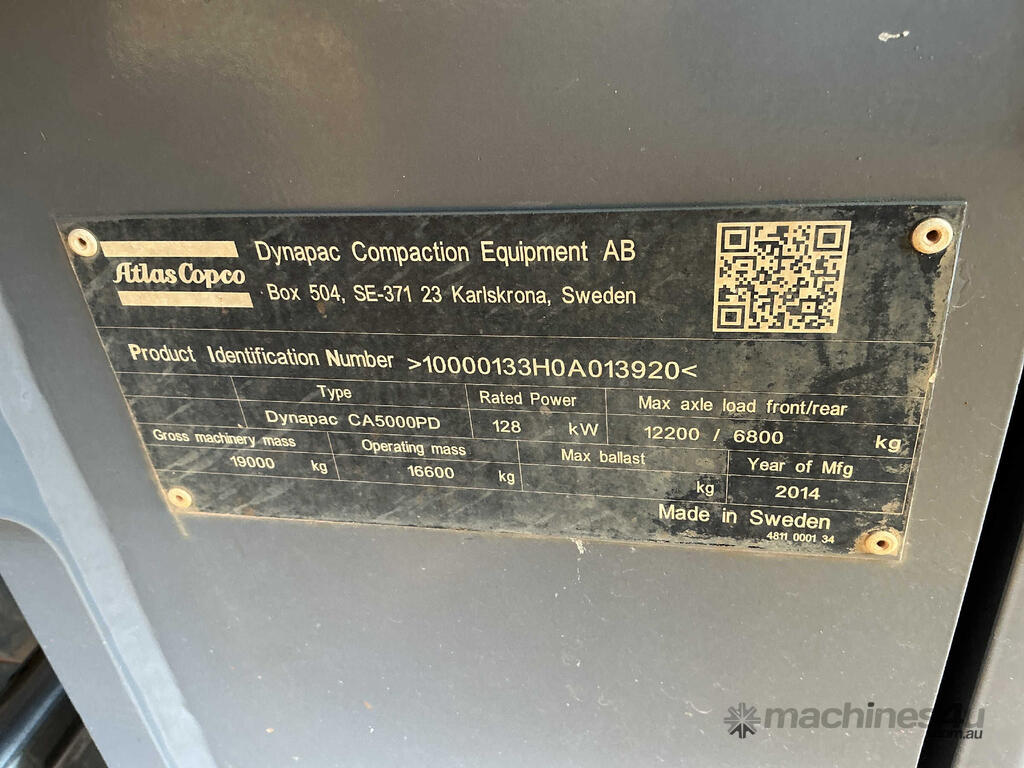 CP: CIRCA 2014,Built: 03/2014,Dynapac,CA5000PD,Roller (Padfoot),Engine #: C3UI128B,6.1 Ltr,6 Cyl,Diesel,Odometer not visible,6501 (Hrs. Showing on Hour meter),Colour: Yellow,Unregistered,Chassis: 10000133H0A013920,Serial No: 11584788,ROPS No: ,FOPS No: ,Sold with No Plates
