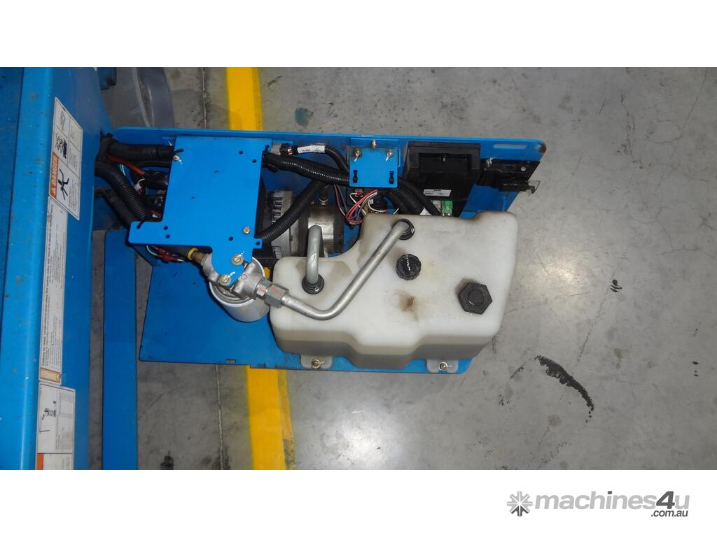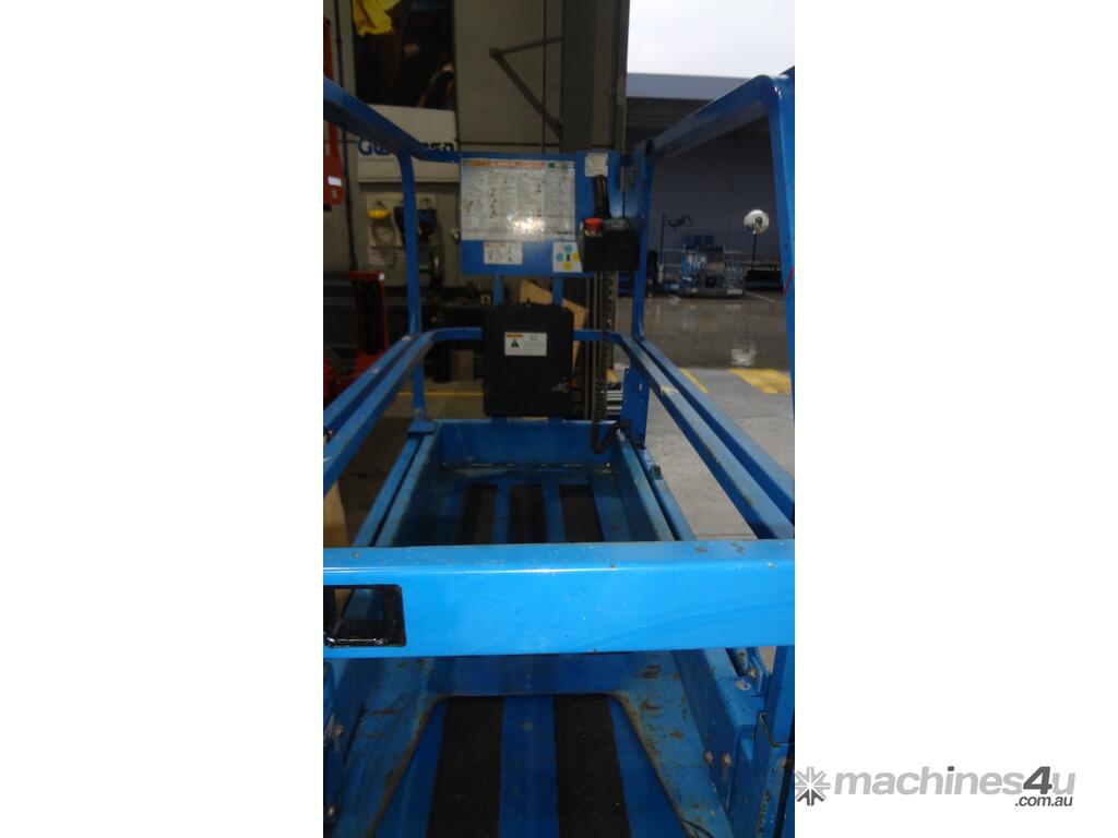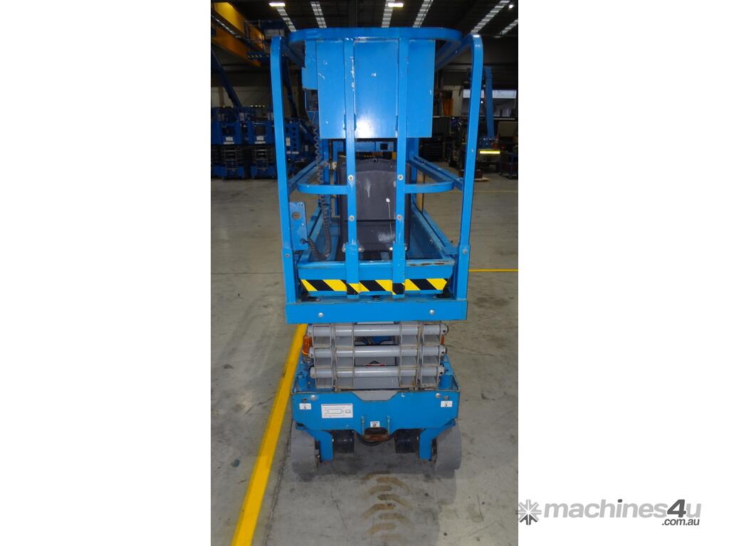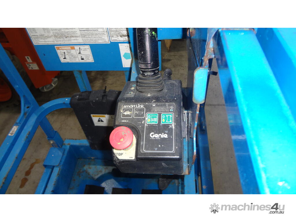 For sale is a 2014 Genie GS1932, a narrow electric scissor lift with a compact design, ideal for tight spaces and smooth surfaces.